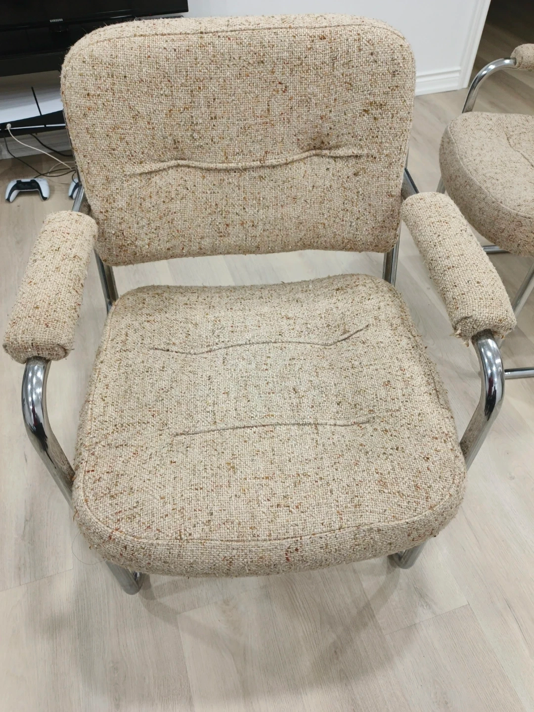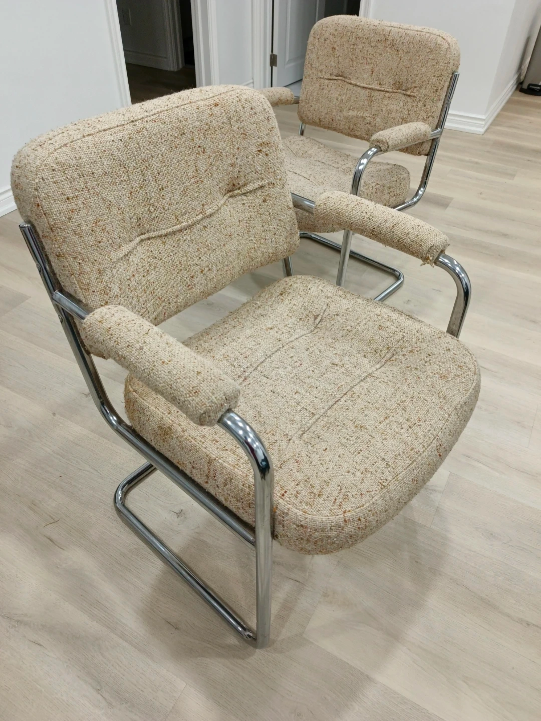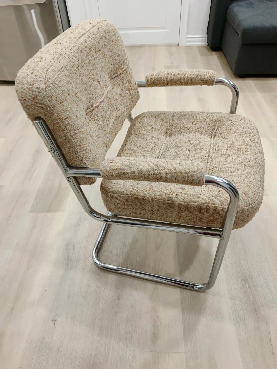 Selling a vintage armchair with a steelcase and neutral-toned fabric upholstery. It has a unique design and is in good condition for its age. The chair provides comfortable seating with padded armrests. Perfect as an accent piece!