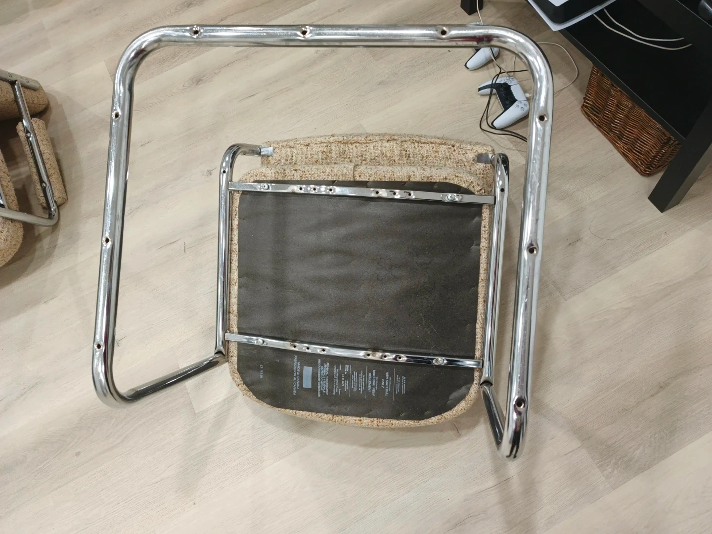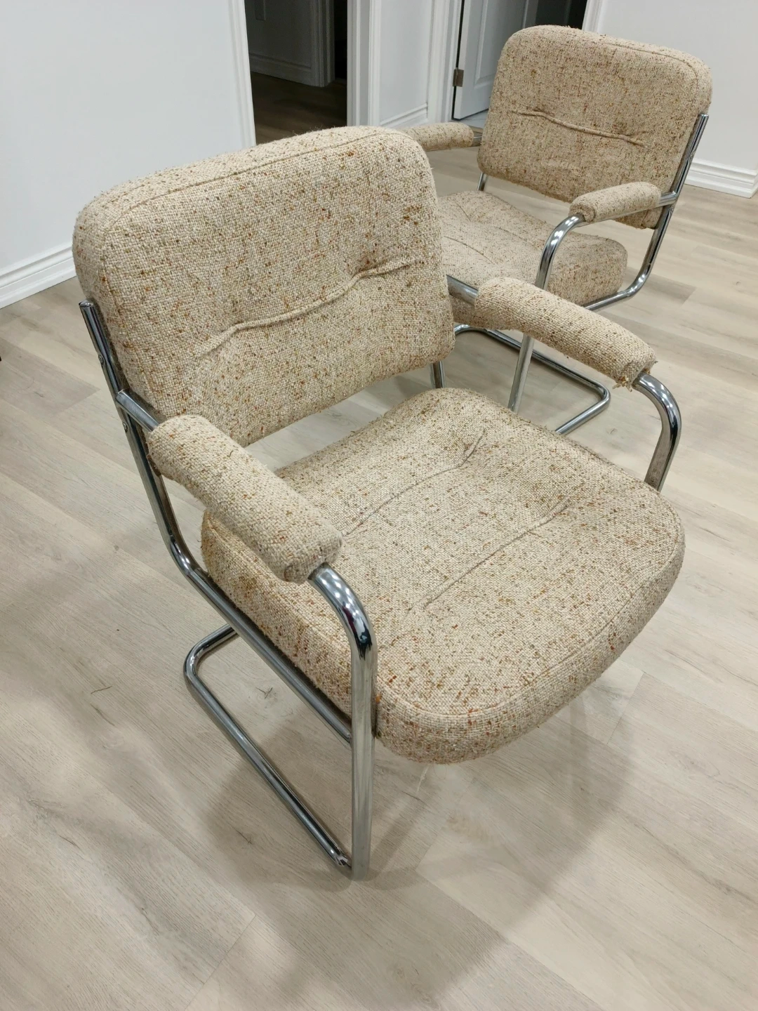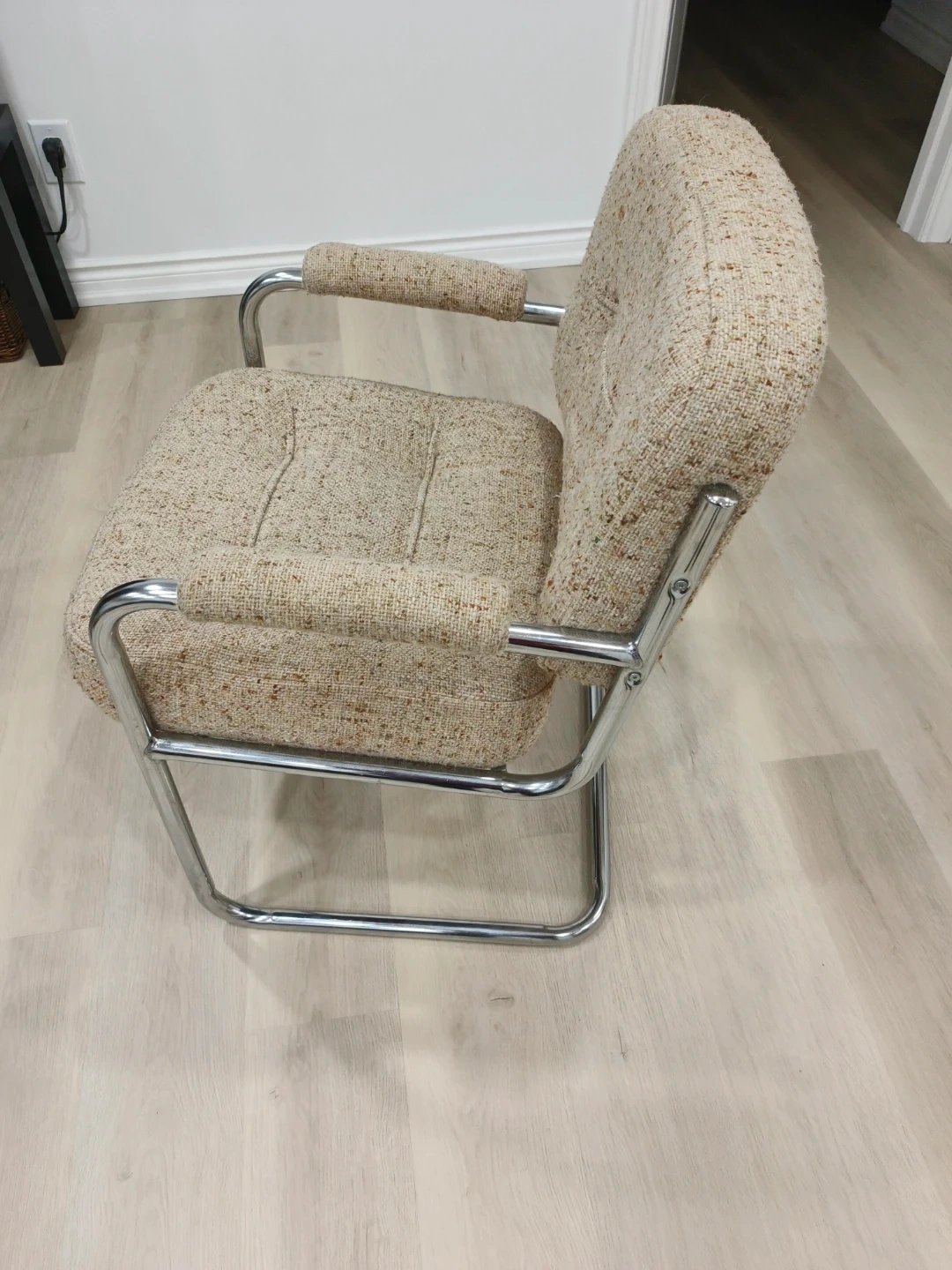Selling a vintage armchair with a steelcase and neutral-toned fabric upholstery. It has a unique design and is in good condition for its age. The chair provides comfortable seating with padded armrests. Perfect as an accent piece!