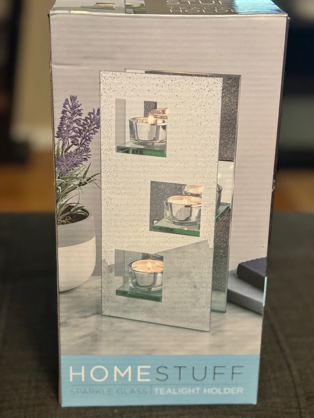 Light up your home with this HOMESTUFF Sparkle Glass Tealight Holder! The contemporary mirrored frame with a glitter design will sparkle in the candlelight, great for coffee tables or dining table centrepieces. Dimensions are 12 x 6 x 28 cm.