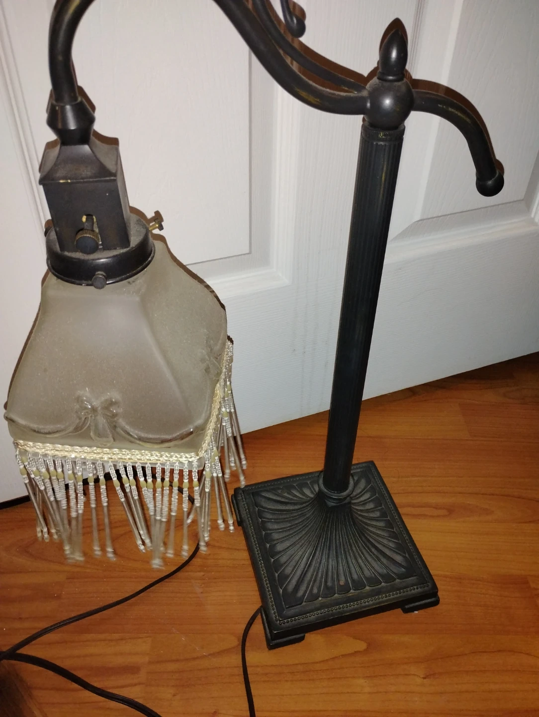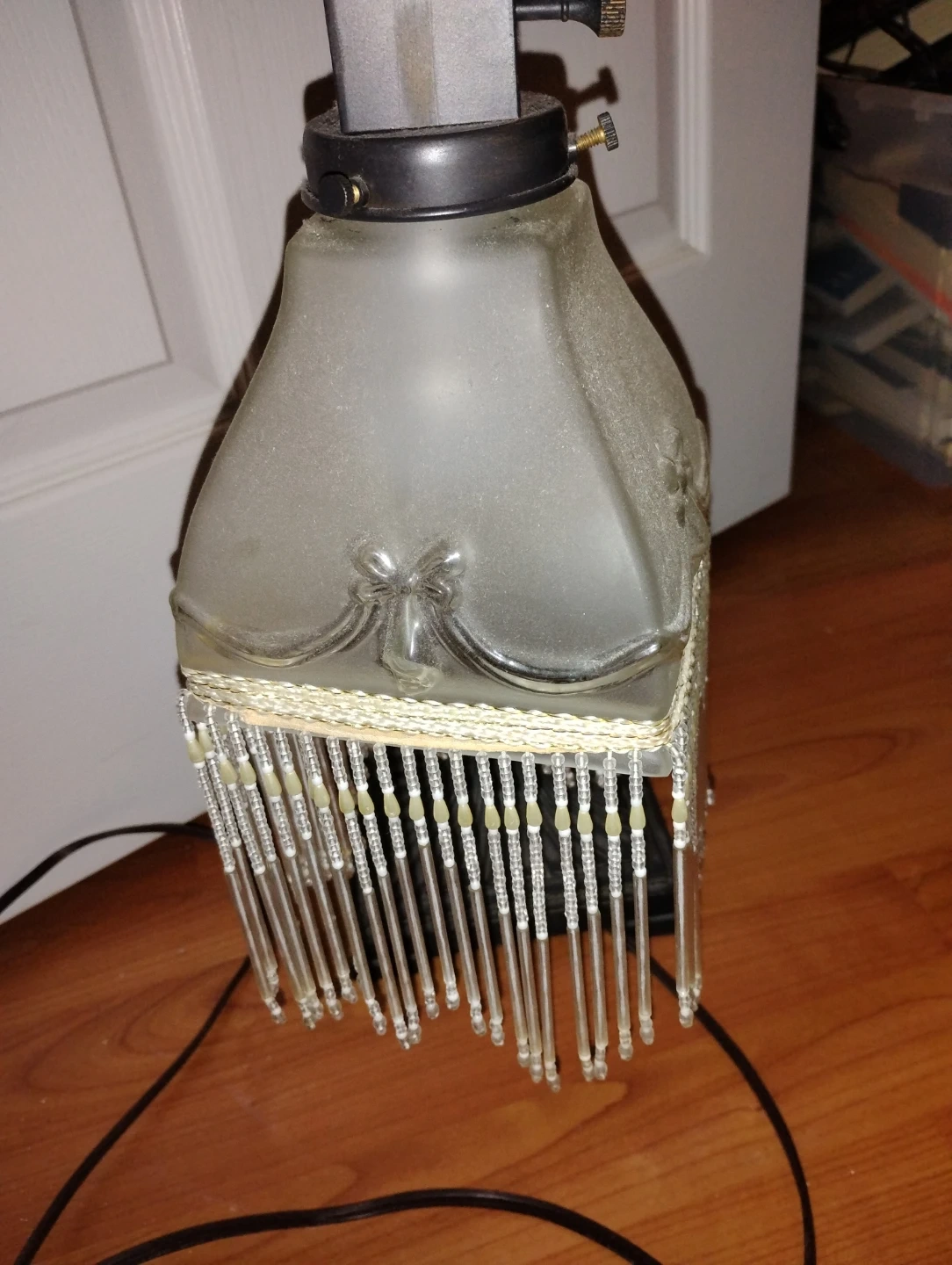 Selling a vintage-style floor lamp with a unique beaded shade. It has a classic design and would add a touch of elegance to any room. It's in good condition and ready to brighten up your space