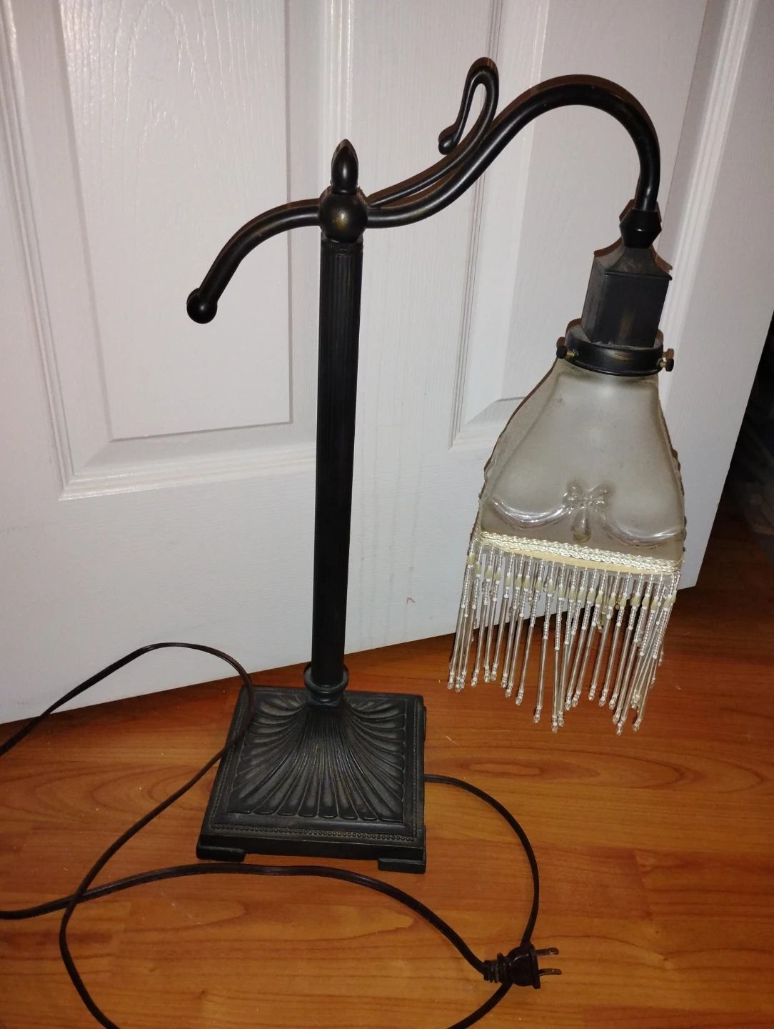 Selling a vintage-style floor lamp with a unique beaded shade. It has a classic design and would add a touch of elegance to any room. It's in good condition and ready to brighten up your space