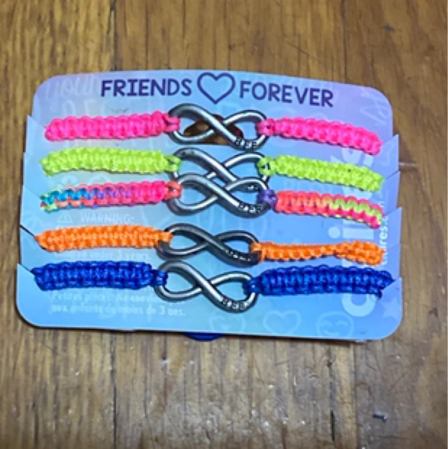 Selling a set of 5 adorable "Friends Forever" infinity bracelets! They come in a variety of fun, bright colors: pink, neon green, orange, and blue. Perfect for sharing with your besties