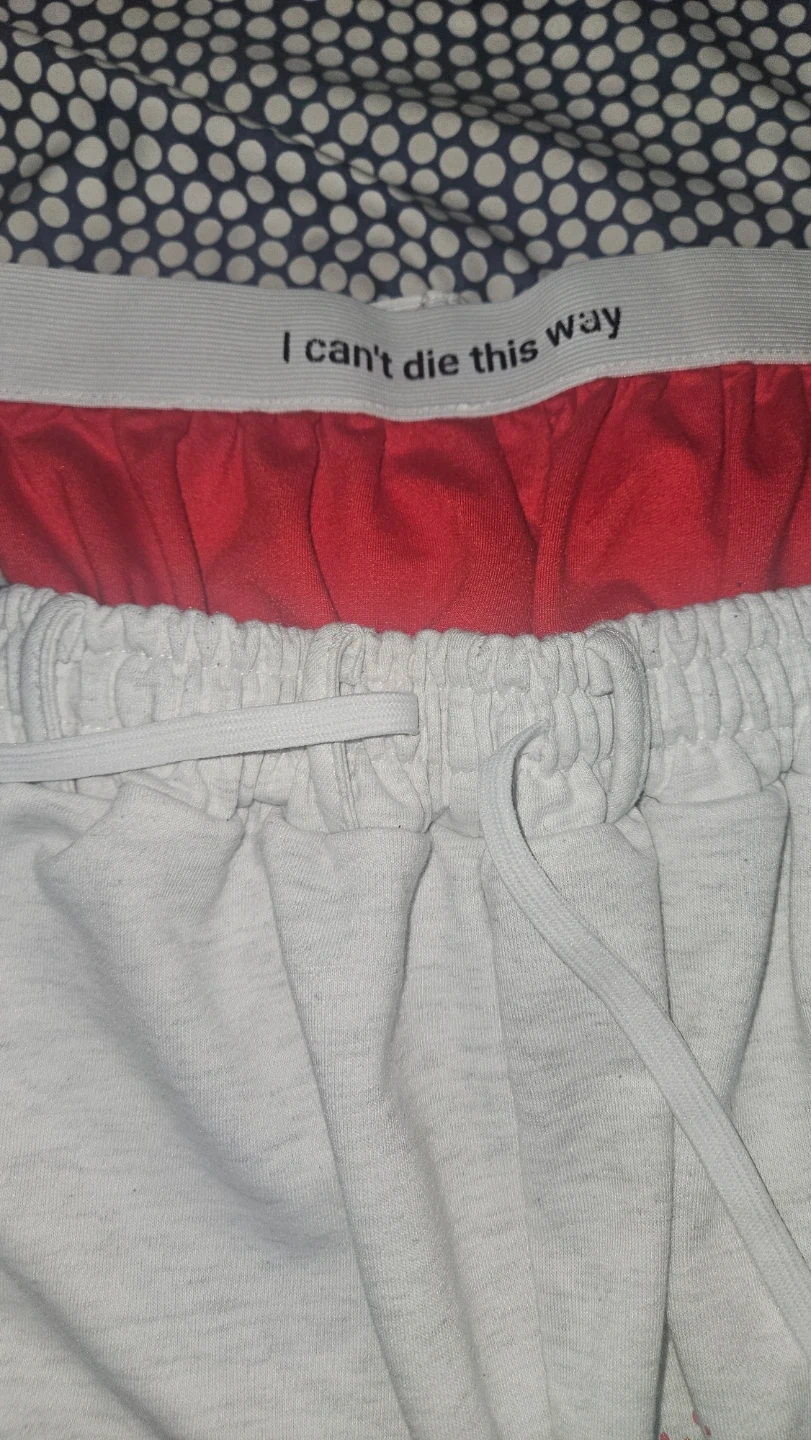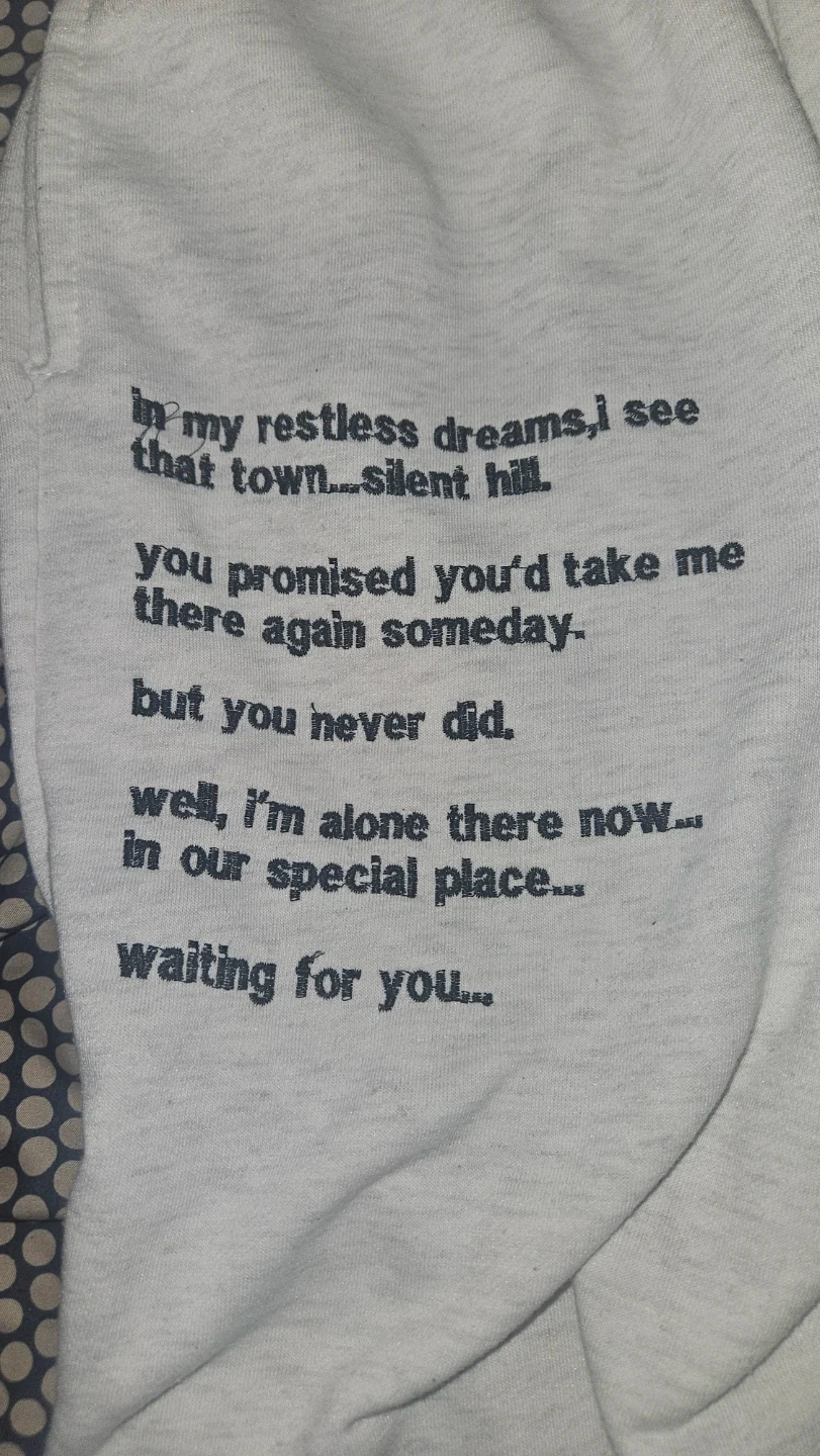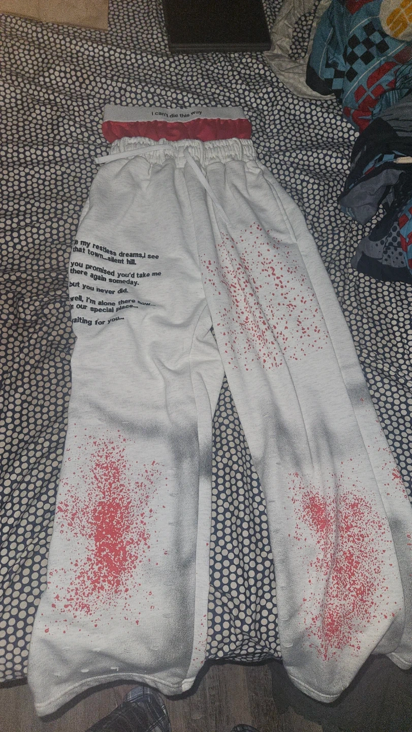 Selling a pair of Silent Hill inspired sweatpants! They're a size Large and feature text from the game on the upper left leg. The design also includes red splatter graphics. These are perfect for any Silent Hill fan!