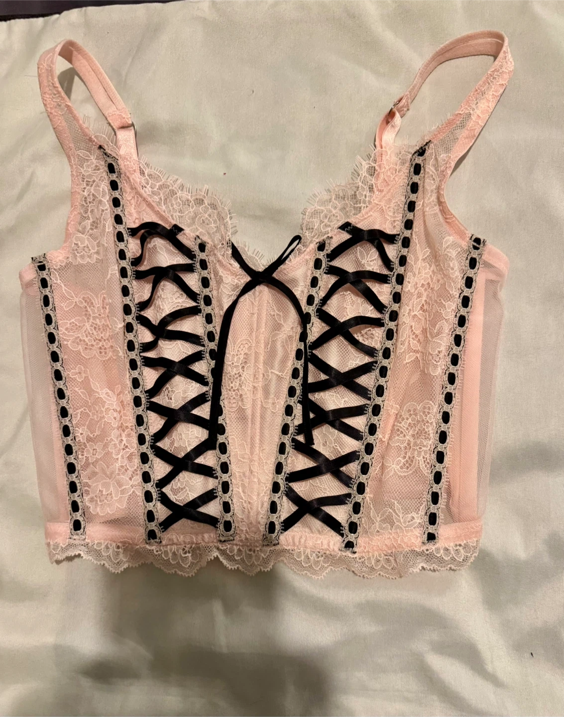Selling a Victoria's Secret Pink corset top. It features a lace design with black ribbon detailing. Perfect for adding a touch of elegance to your wardrobe!