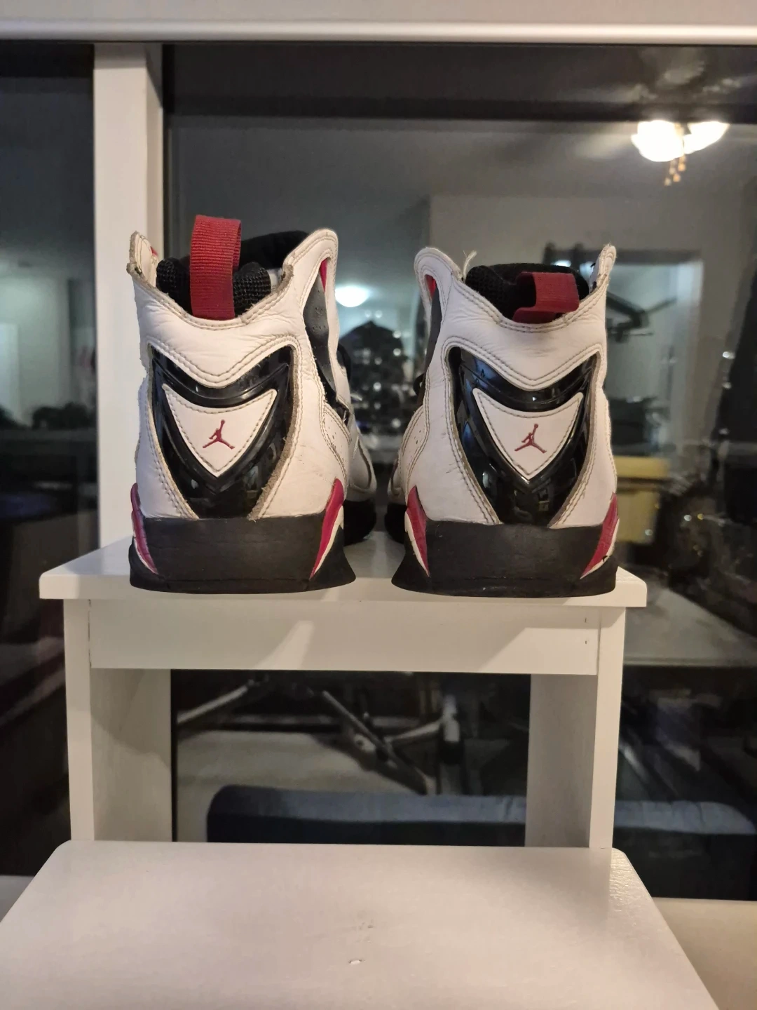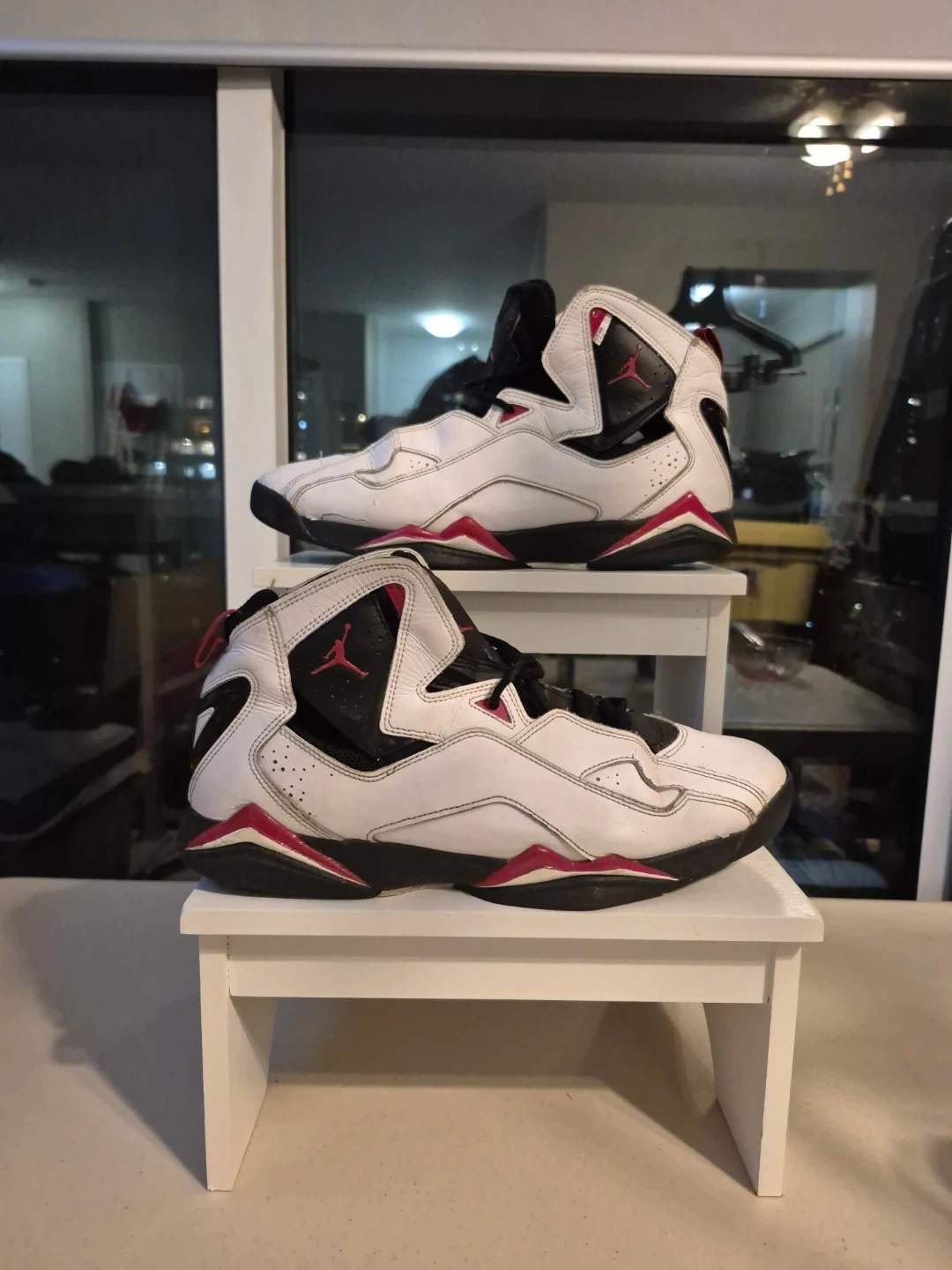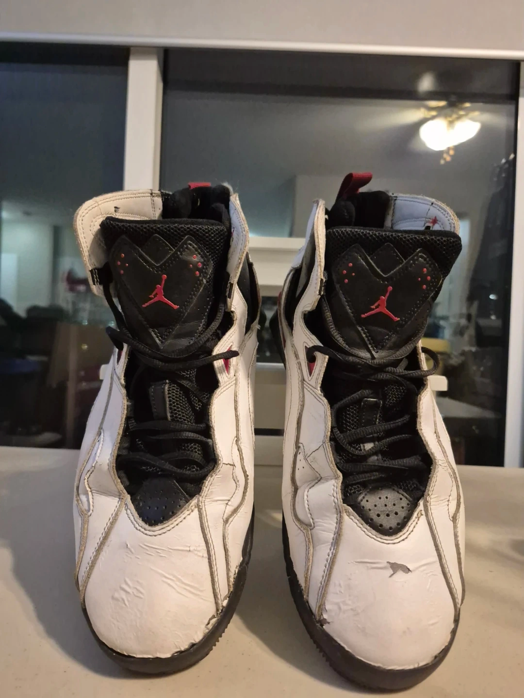 Selling a pair of Air Jordan True Flight shoes. They're white with black and red accents and show some signs of wear in the front.