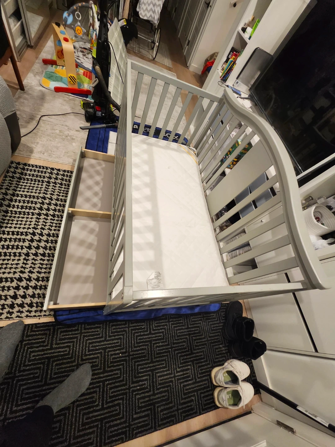 Selling a Graco crib in grey! It has some visible wear and tear, as shown in the pictures. The manufacturing date is 2019 August. It also has a drawer at the bottom for extra storage. The dimensions are in the photo.