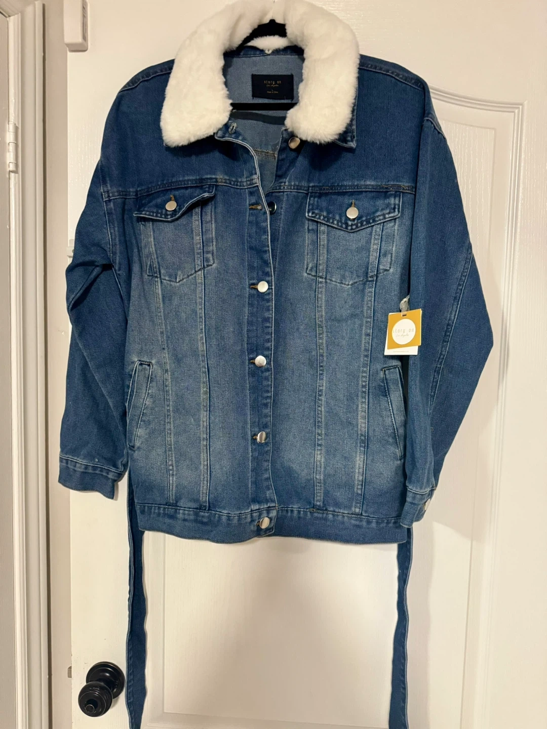 Here's a stylish denim jacket from Story An Los Angeles! It features a cozy faux fur collar and a tie waist. Perfect for adding a touch of flair to your outfit