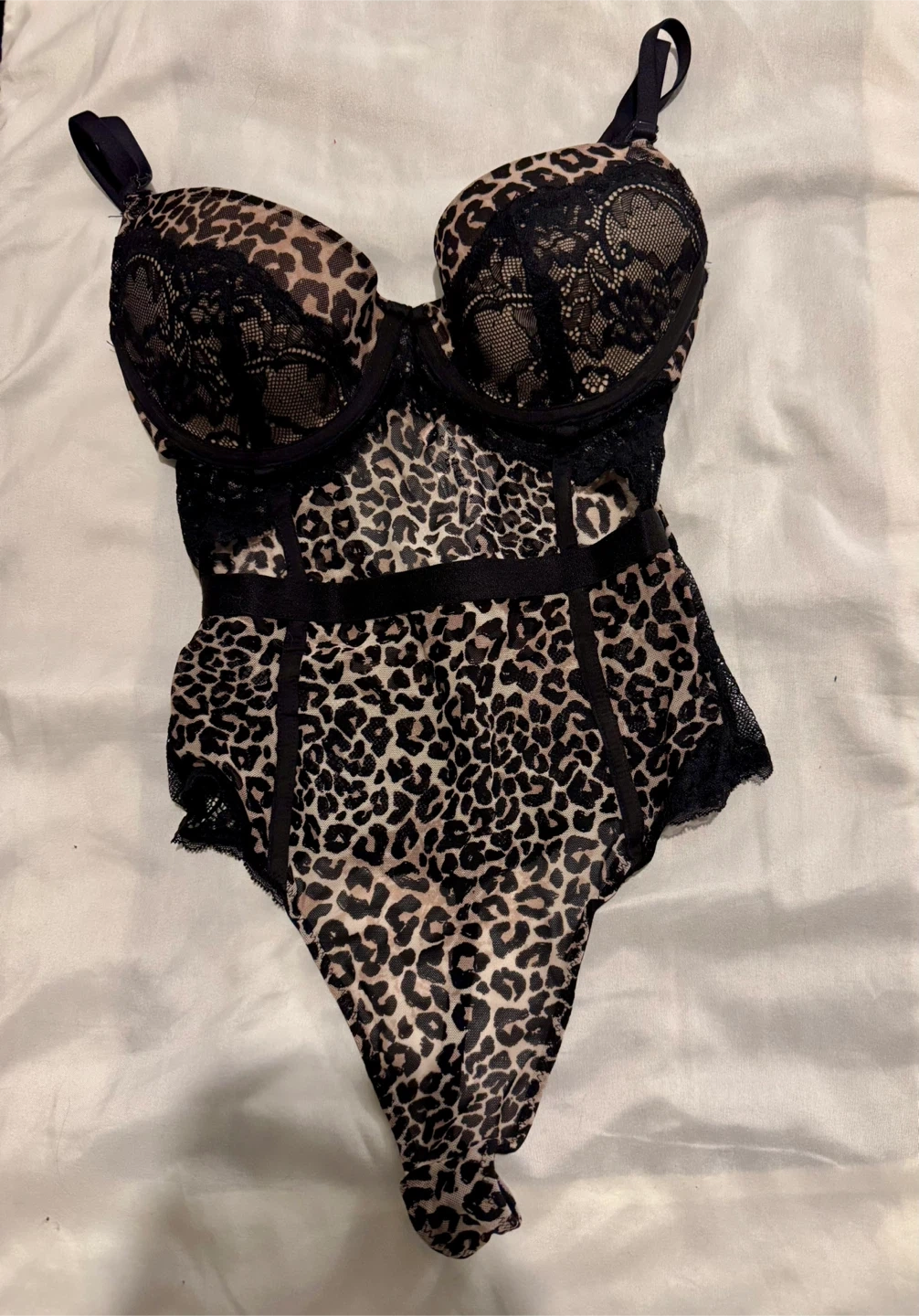 Here's a cute leopard print bodysuit! It features black lace detailing and adjustable straps. Perfect for a night out or a fun addition to your wardrobe!