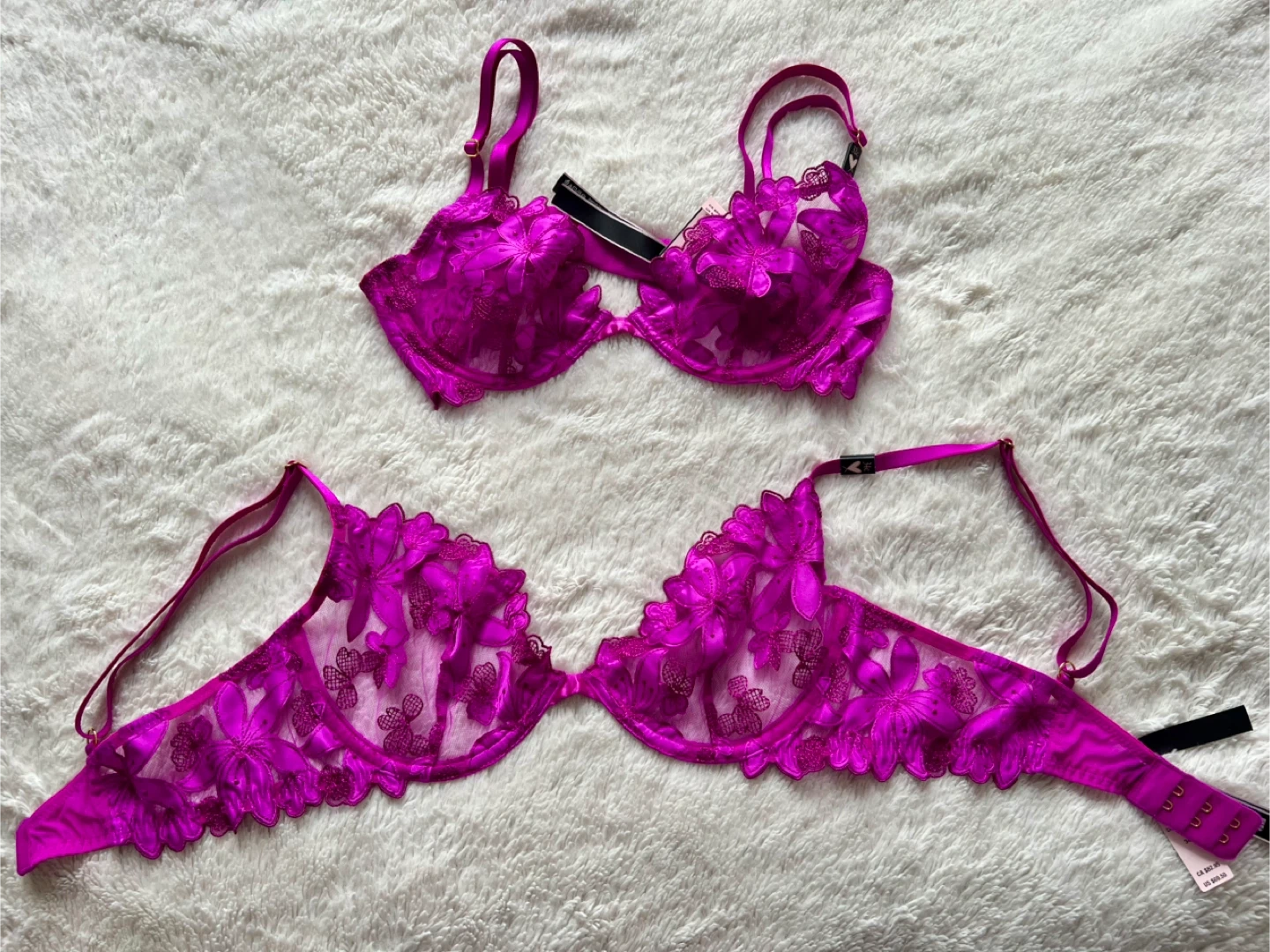Selling a beautiful Victoria's Secret bra with a purple floral design. It's in great condition and ready for a new home!