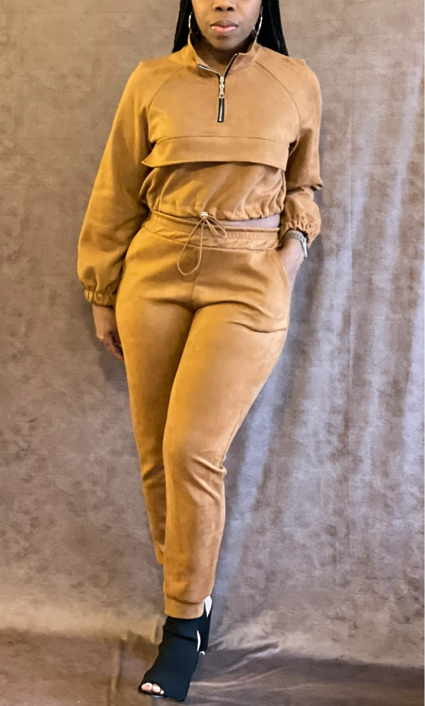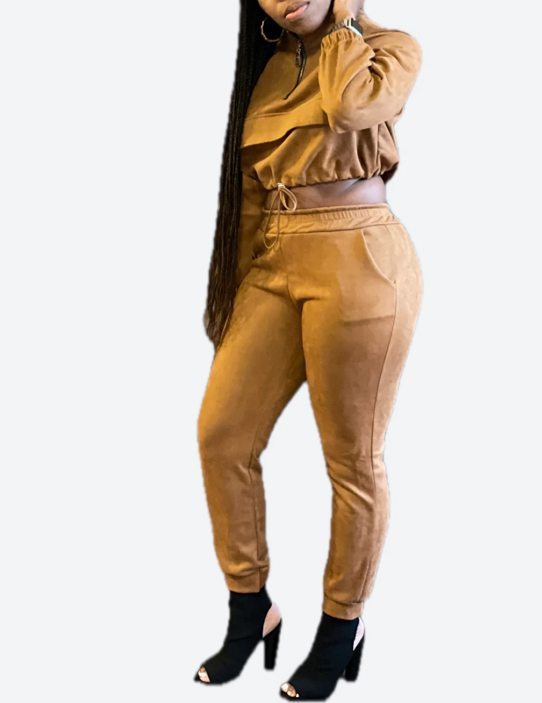 It features a cropped long-sleeve top with a zipper and matching pants with a drawstring. Perfect for a casual and comfy look!