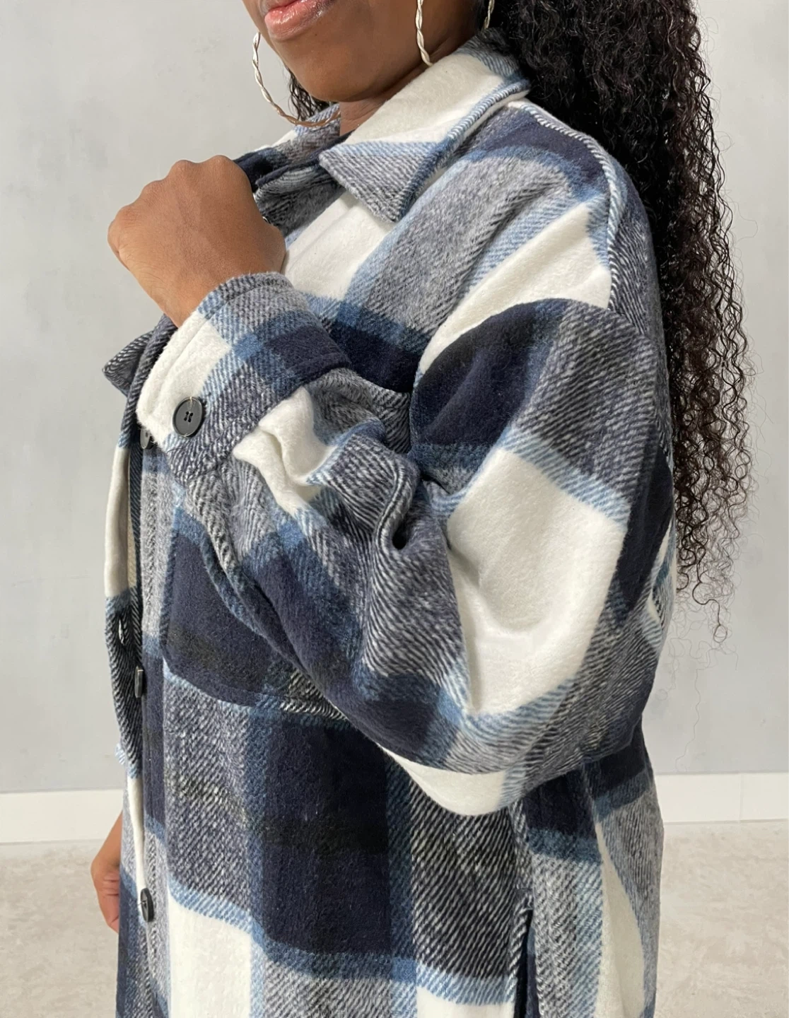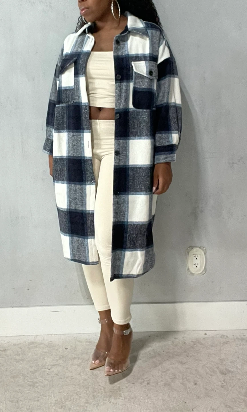 Here's a cozy plaid shacket in blue, white, and black! It's perfect for layering during the cooler months.