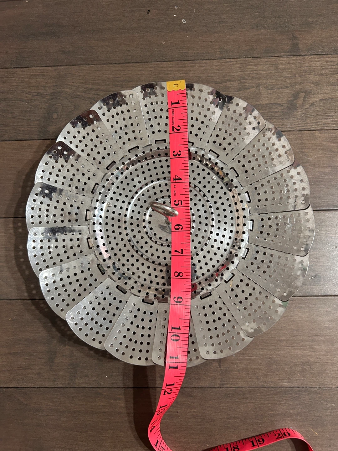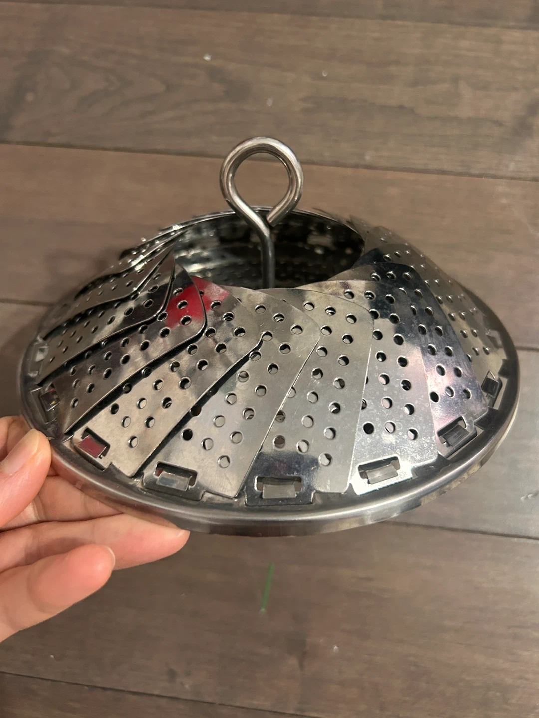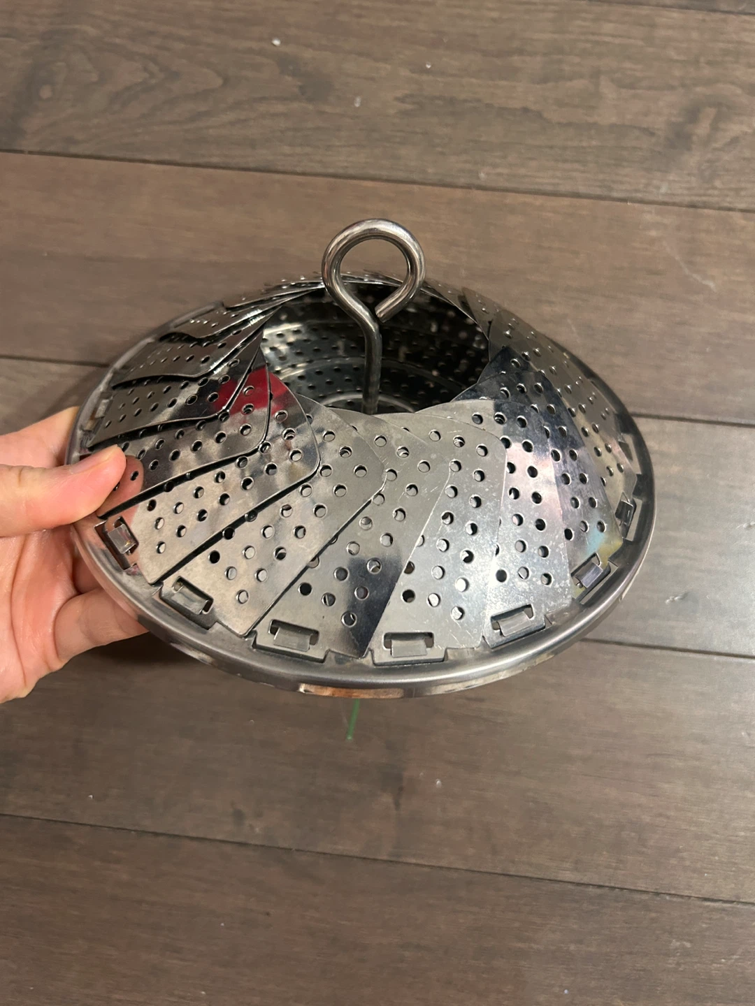 Selling a stainless steel vegetable steamer basket! It's in great condition and expands to fit different pot sizes. It measures approximately 11 inches when fully expanded. Perfect for steaming veggies, dumplings, and more!