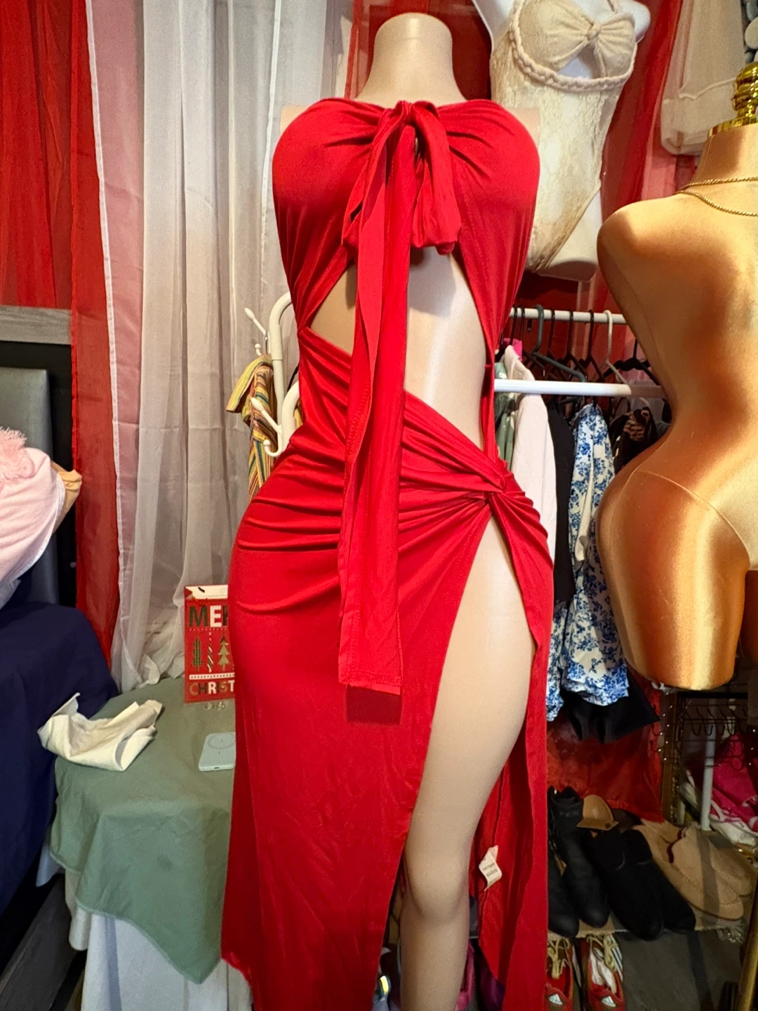 Here's a stylish red dress with a tie-front detail and a cutout design! It also features a slit. Perfect for making a statement!