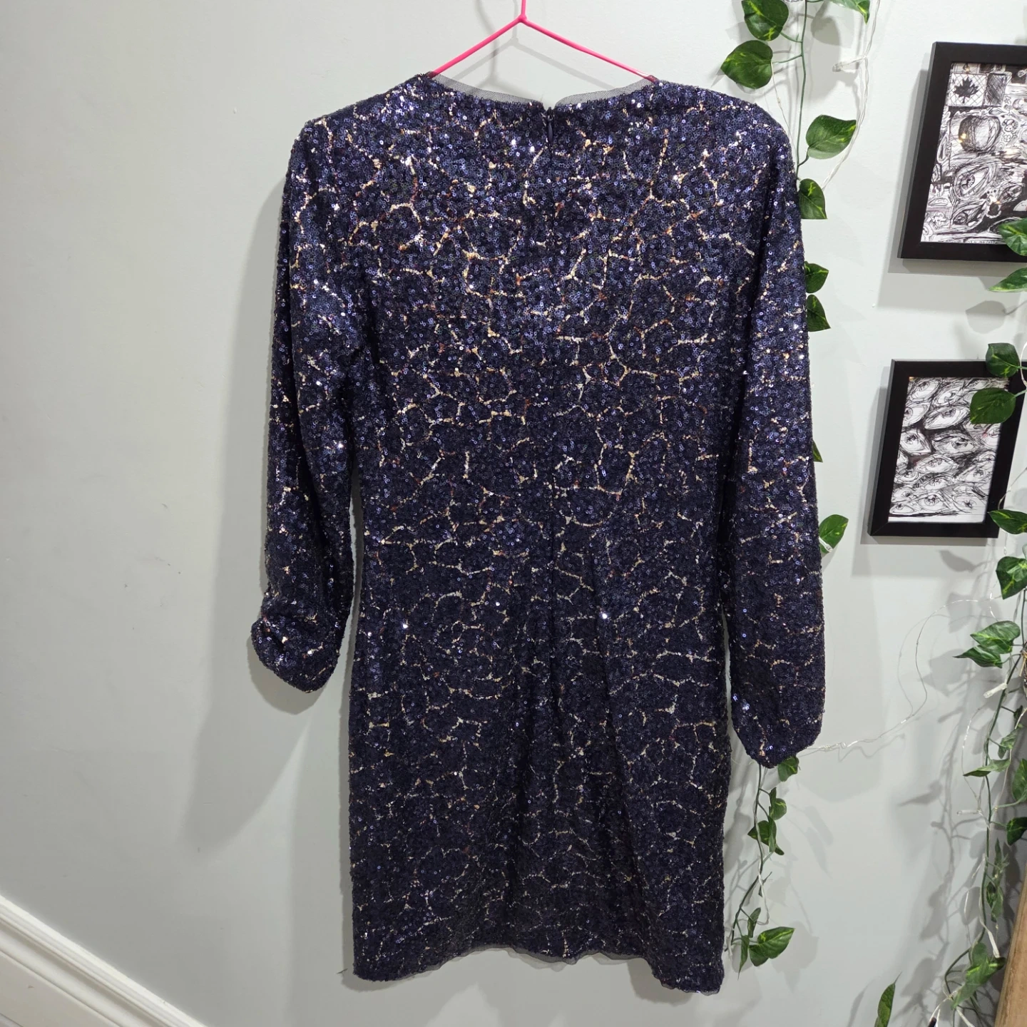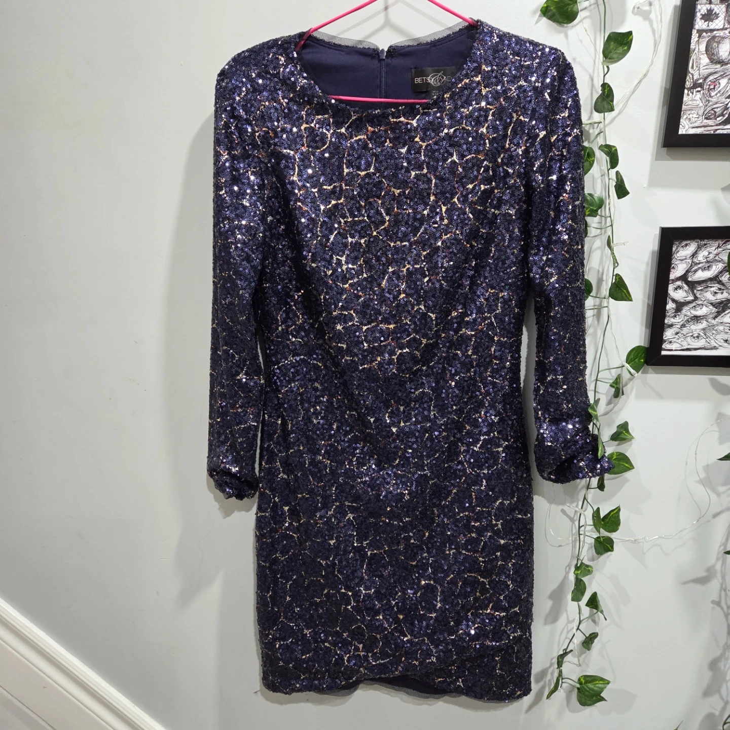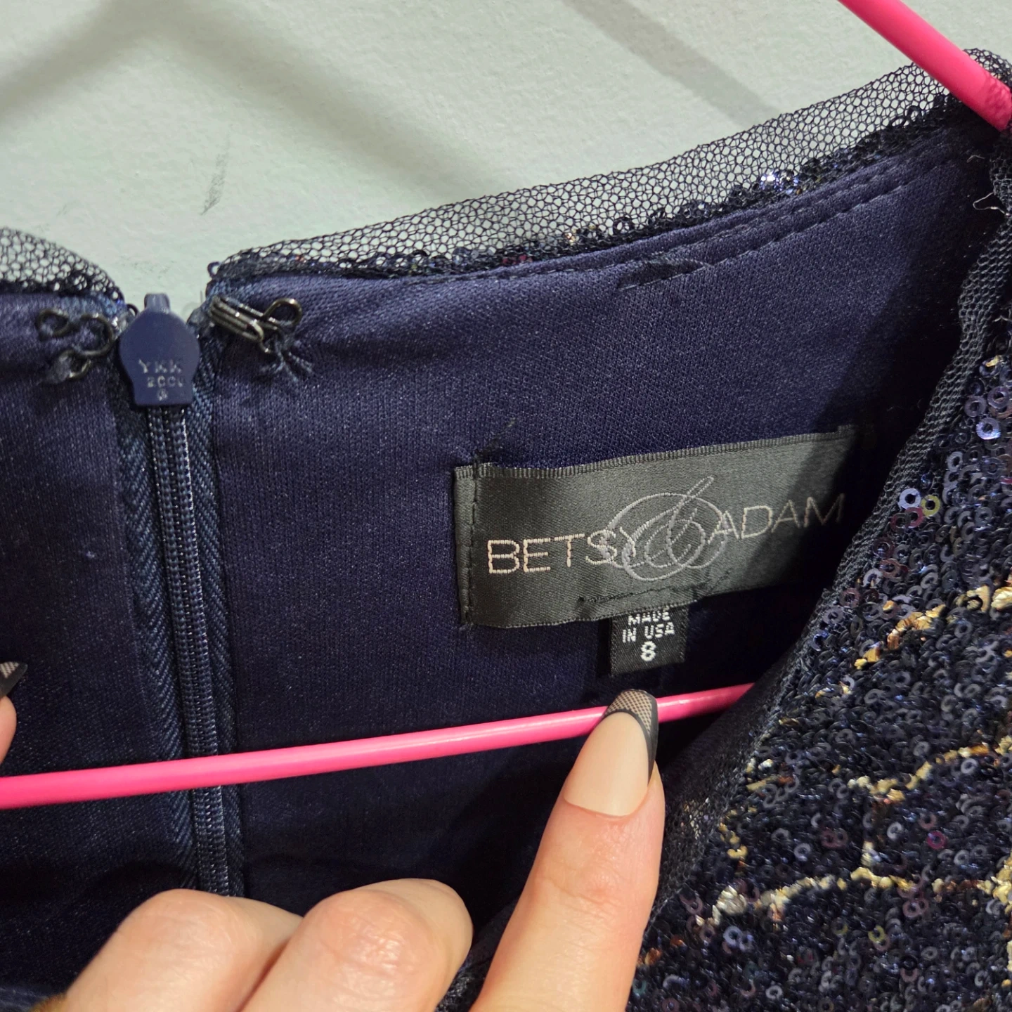 Selling a beautiful Betsy & Adam sequin dress! It's a size 8 and features a stunning navy and gold sequin pattern. Perfect for a special occasion! Worn once for a New Year's event ans in perfect condition ๐.