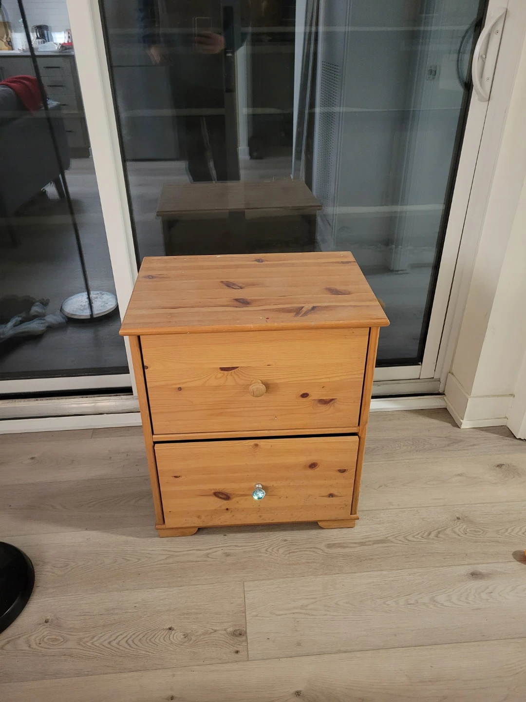 Selling a wooden nightstand with two drawers! It's perfect for adding some extra storage to your bedroom. The nightstand is in good condition and ready for a new home. It has a light wood finish that would match many decor styles