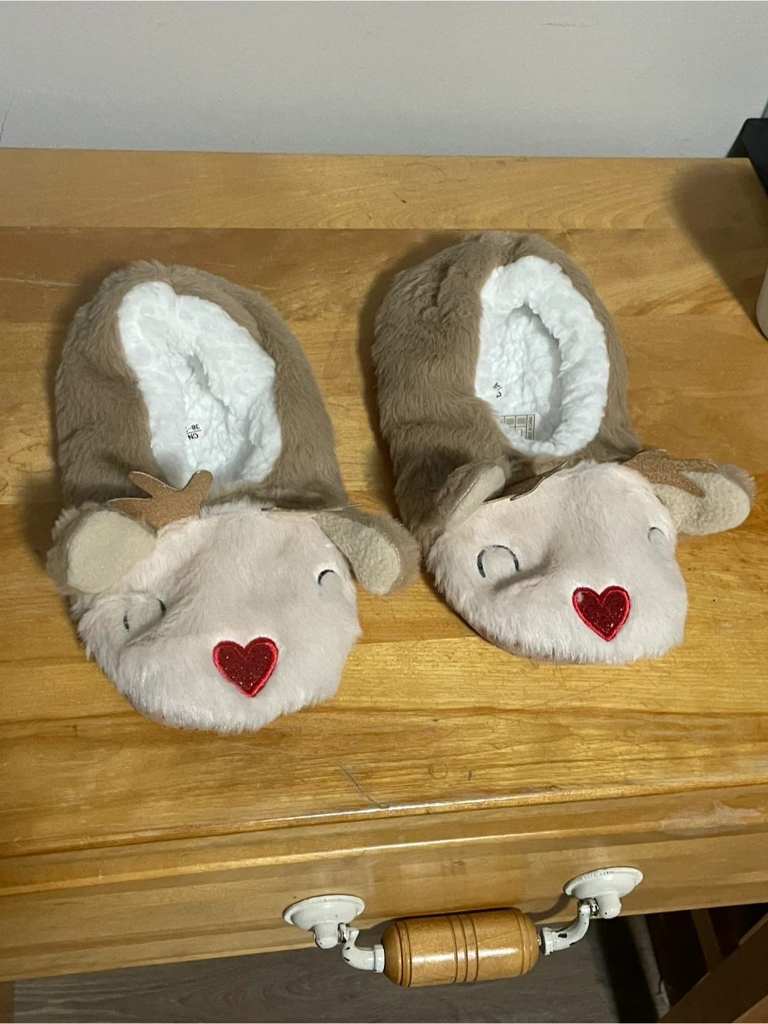These super cute reindeer slippers are in great condition! They're a size 36-37 and feature a soft, plush lining to keep your feet cozy. Perfect for keeping your feet warm on cold days!