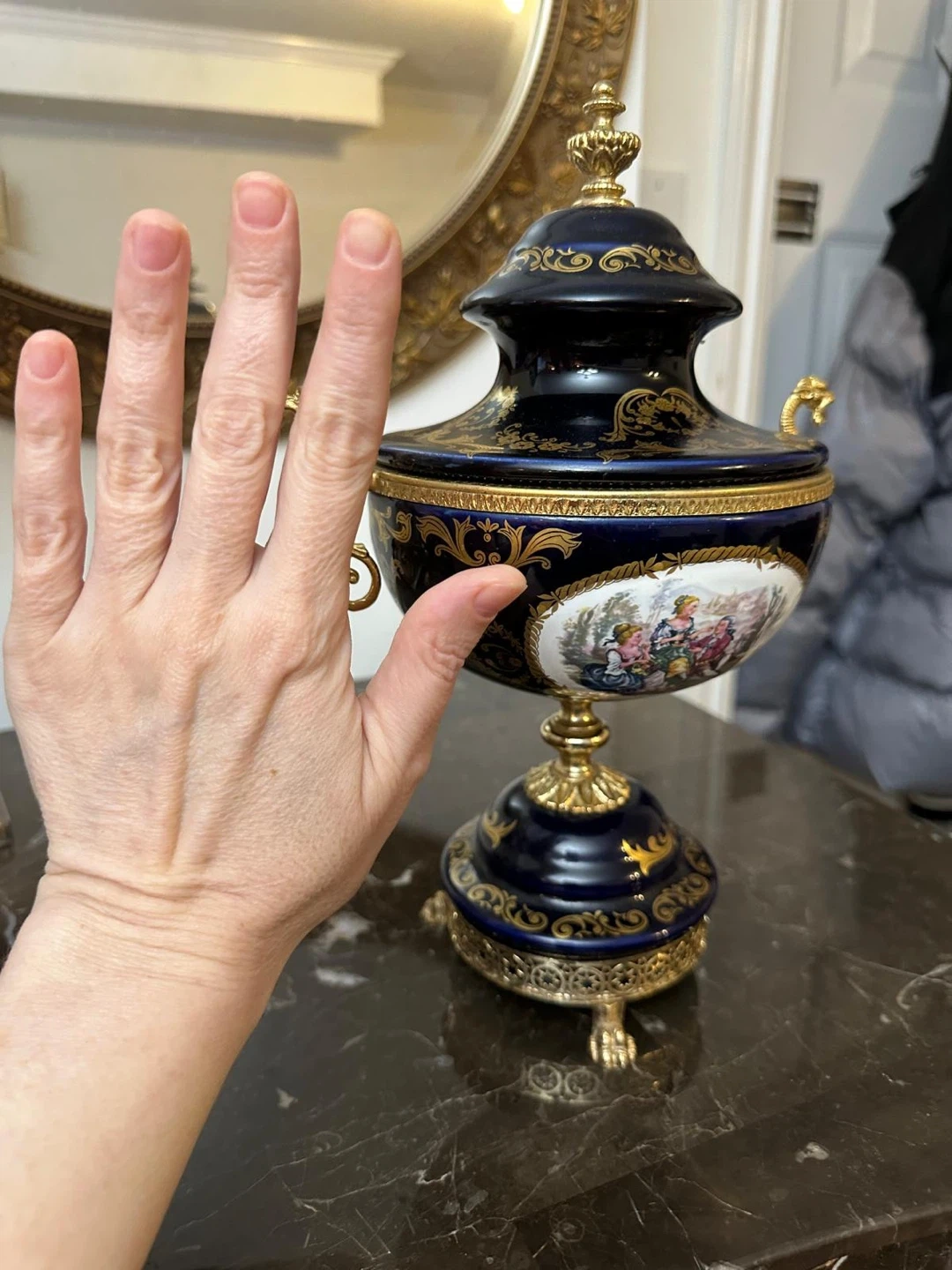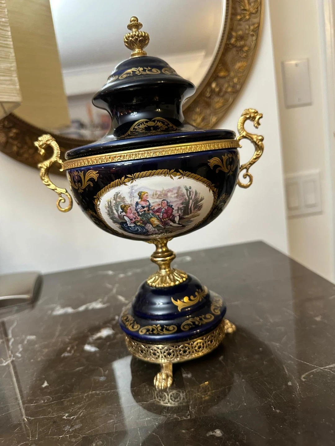 Beautiful antique decorative urn in excellent condition. Features a detailed design with gold accents and a classic scene depicted on the side. Perfect for adding a touch of elegance to any room!