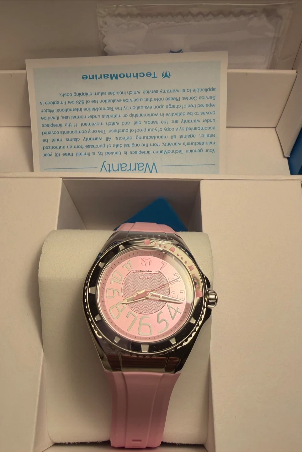Selling a brand new TechnoMarine Lusse mare 38mm watch in pink! It comes with its original box and warranty information. This stylish timepiece is ready to add a pop of color to your wrist. Original price $299 . Cheaper than sale price at the store . Great deal beautiful watch ! Bracelets don’t come with it .i have added the blue TechnoMarine case for its protection for free .
