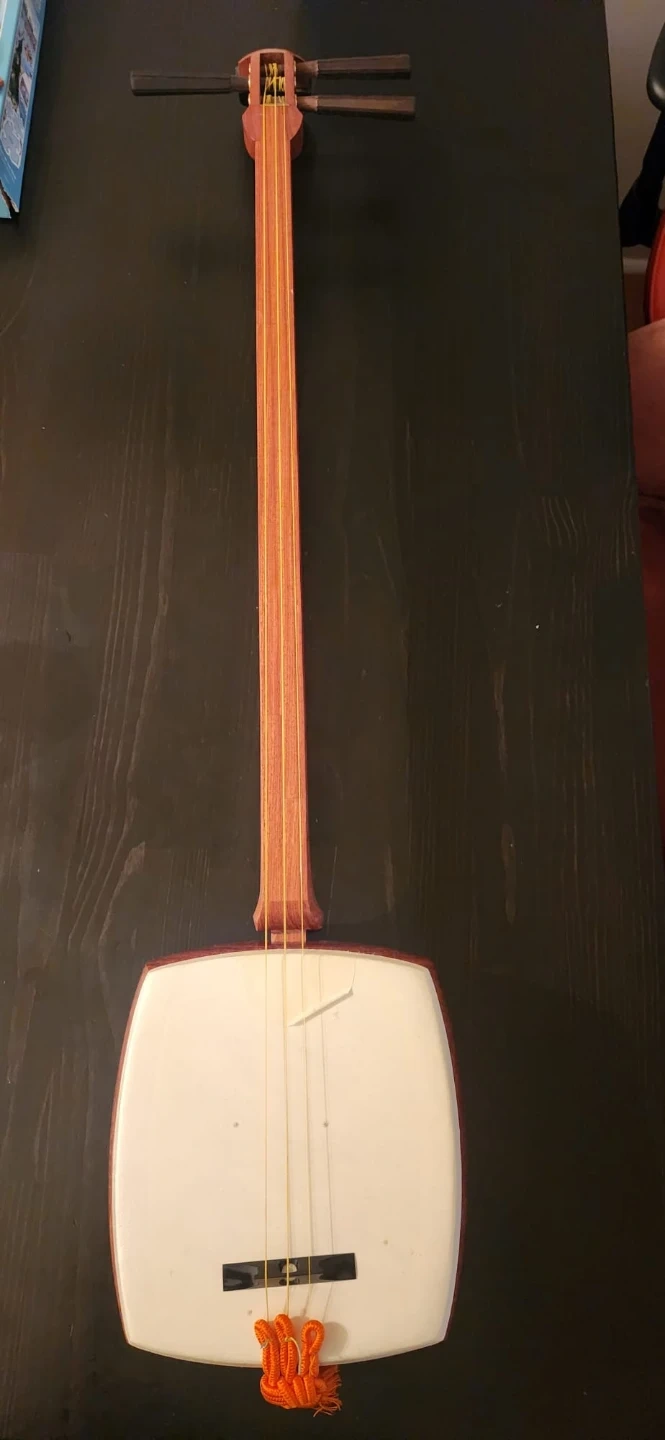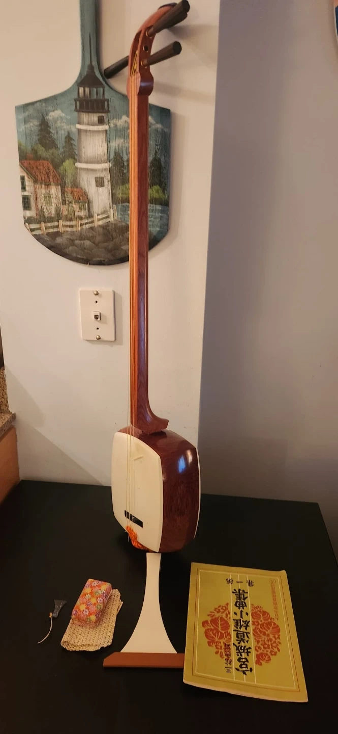 Selling a shamisen, a traditional Japanese string instrument. It comes with a case and other accessories as pictured. It appears to be in good condition and ready to play!