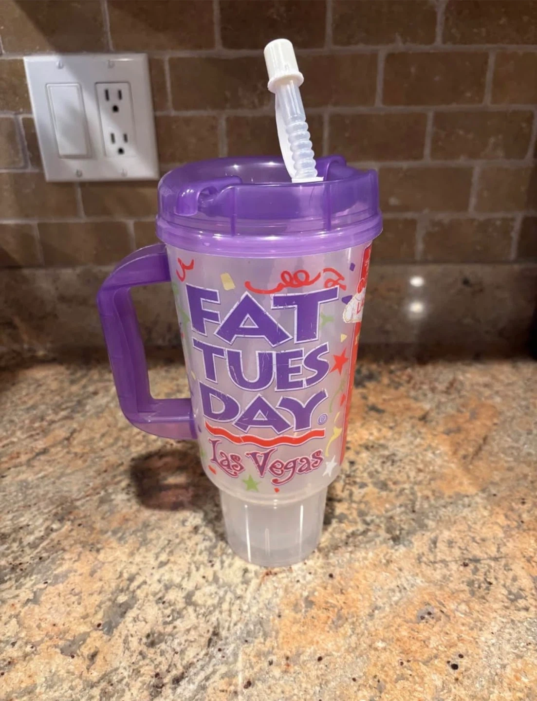 4 Fat Tuesday Las Vegas cups! Two of them come with a lid and straw, the other two with lids, perfect for your favourite drinks. They’re in good condition and ready for a new home