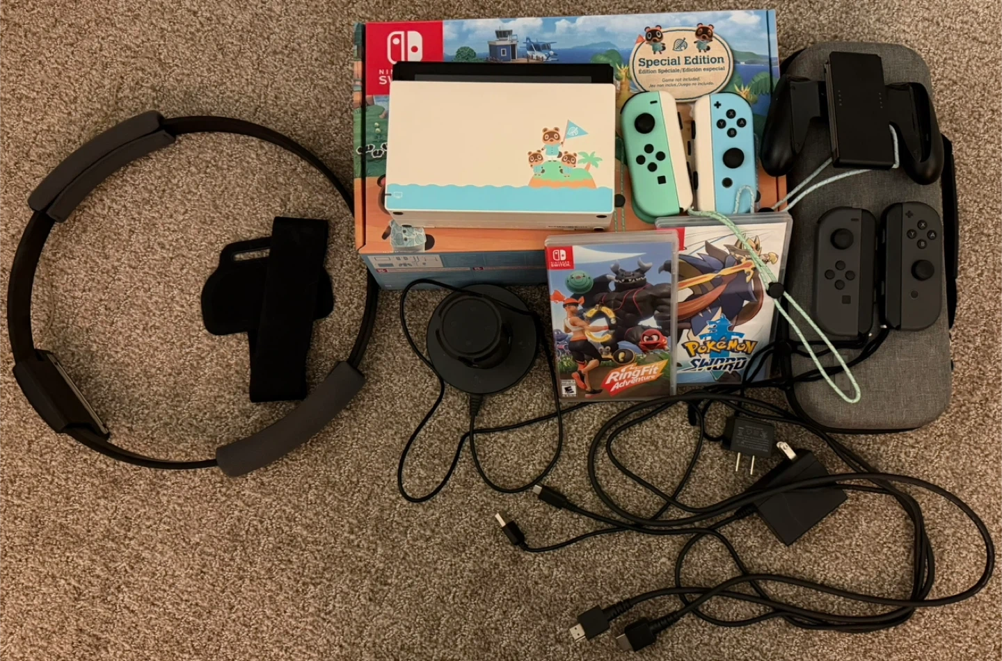 Selling a Nintendo Switch Animal Crossing Special Edition! It comes with the box and all the original components. Two games are included: Pokémon Sword and Ring Fit (with grips and strap). A charging dock, two more Joy-Con and a carrying case are also included!