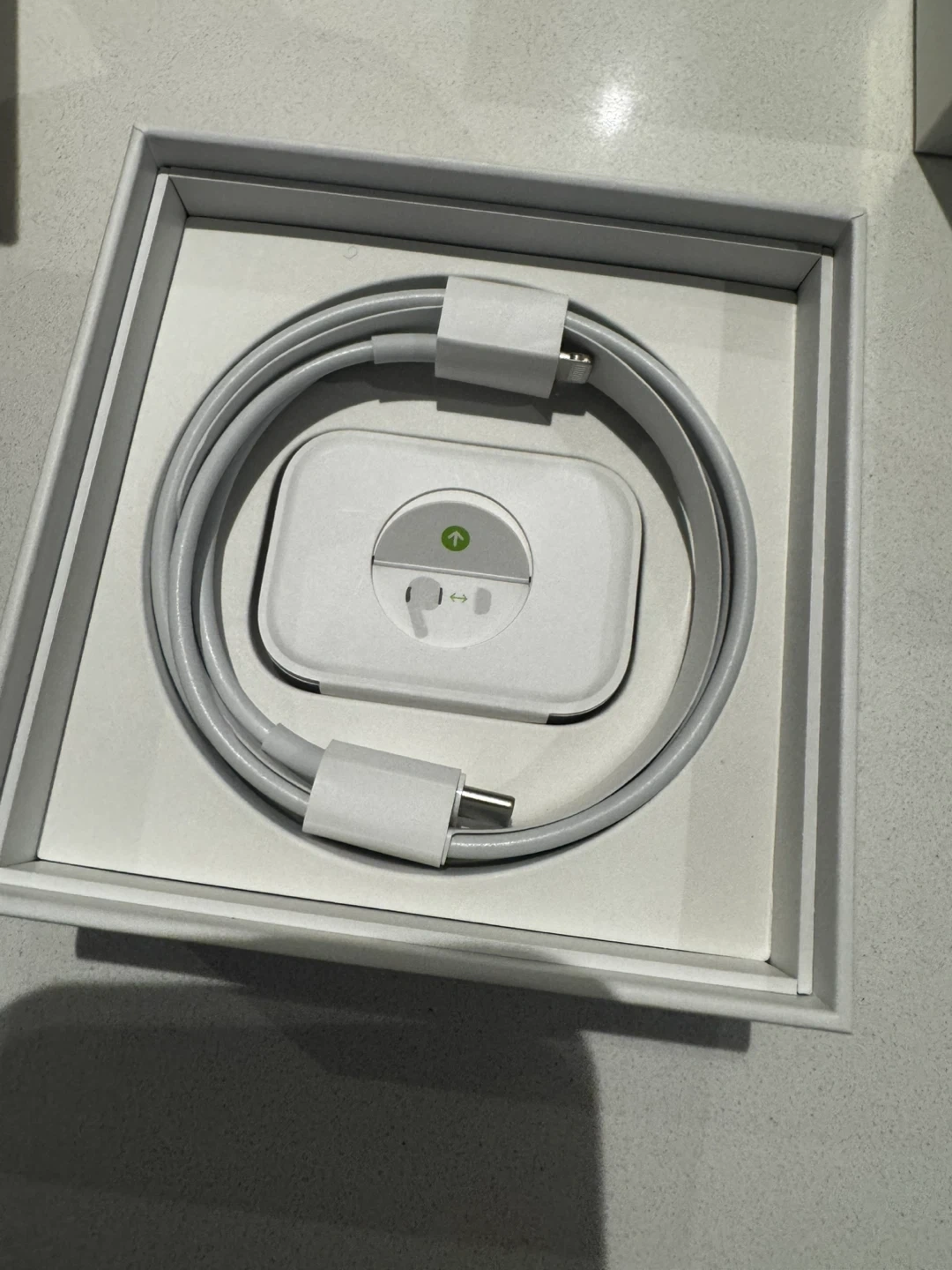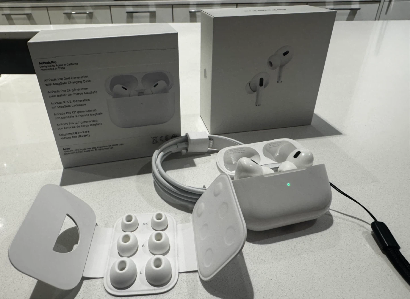 with Lightning Charging Case in very good condition. They come with the original box, a case and lanyard, the charging cable (never used) and extra ear tips (all original in sizes XS, S,M, L).