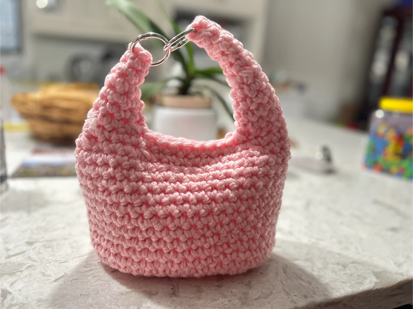 Selling a cute, handmade pink crochet handbag! It's a unique piece with a silver ring detail on the handle. Perfect for adding a pop of colour to your outfit and carrying your essentials
