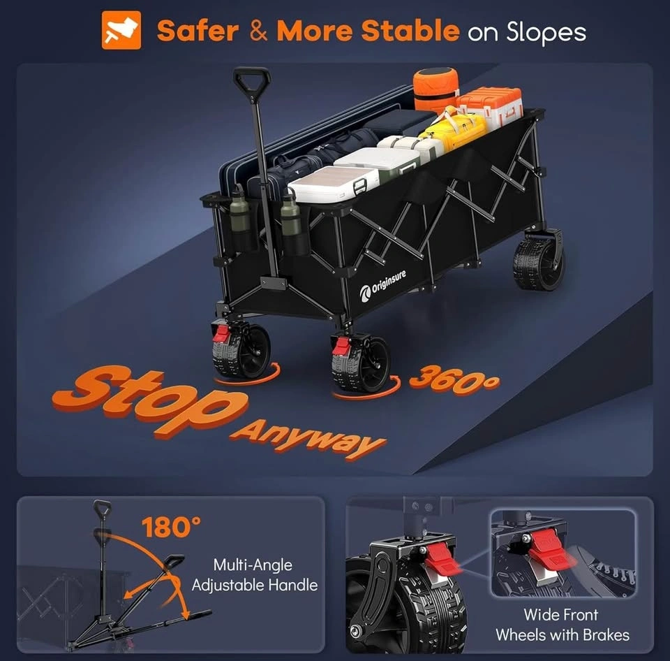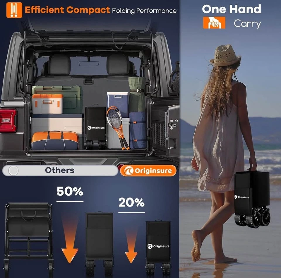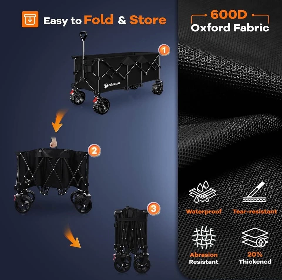 48” heavy-duty collapsible wagon with 300L capacity and 560 lb load limit. Big all-terrain wheels. Perfect for beach, camping, groceries, and sports.