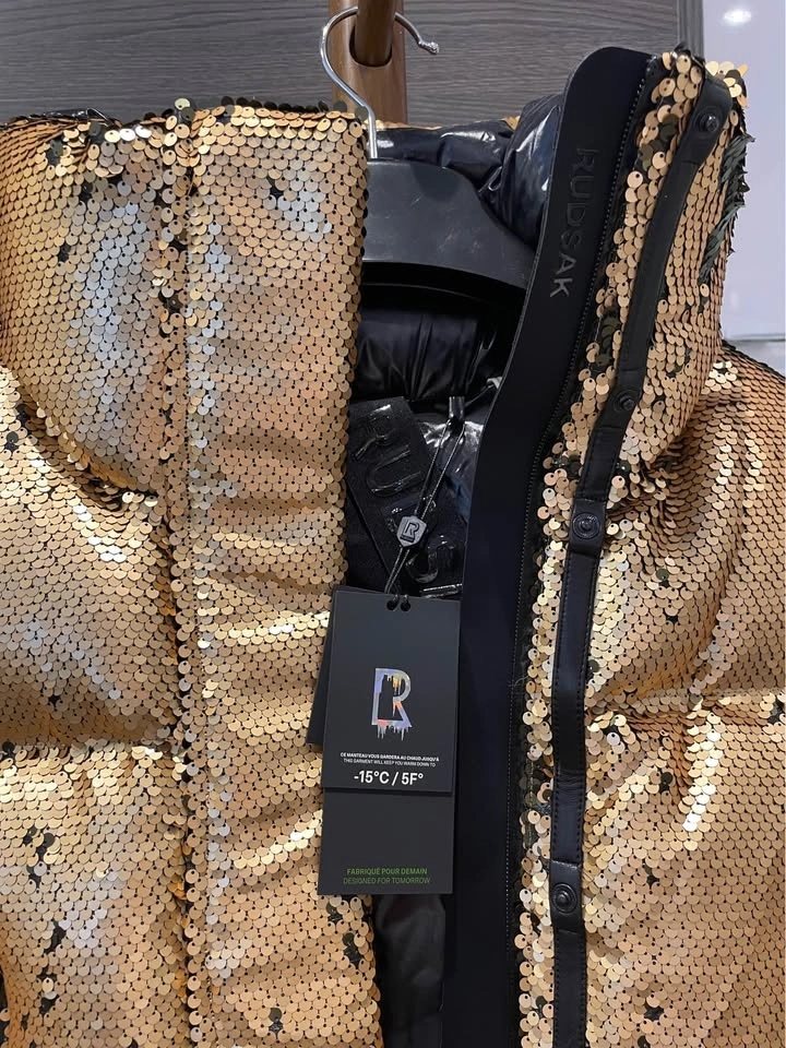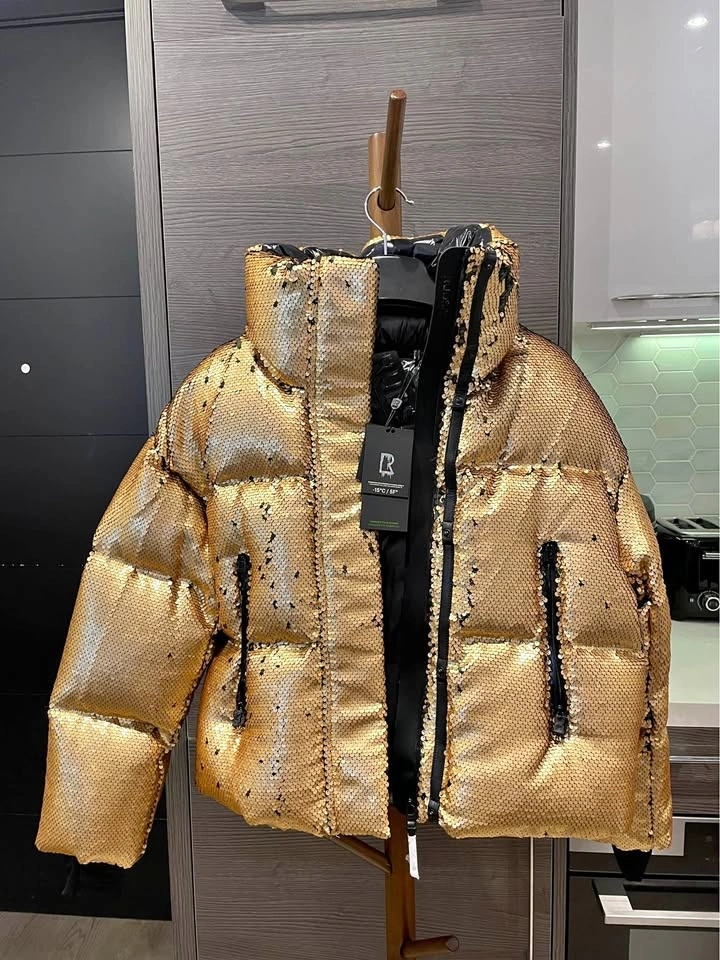 A statement puffer crafted with high-quality dual-tone, direction-sensitive sequins that transition seamlessly from luminous gold to sleek black, offering two distinct looks in one piece.