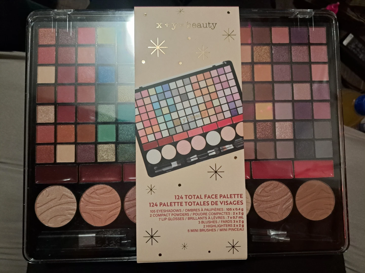 Selling a brand new x+y=beauty 124 Total Face Palette! It includes 105 eyeshadows, 2 compact powders, 7 lip glosses, 3 blushes, 2 highlighters, and 5 mini brushes. Perfect for creating a variety of looks!