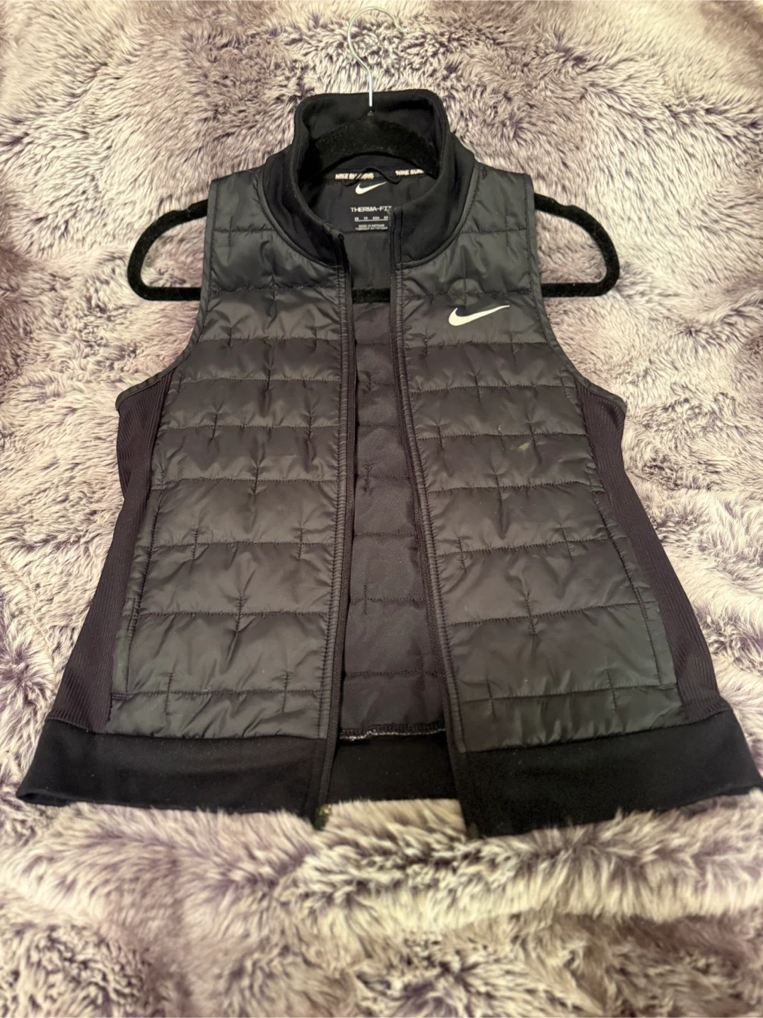 Selling a Nike Therma-FIT vest in black. It's in great condition and perfect for layering! The vest features the Nike logo and a quilted design.