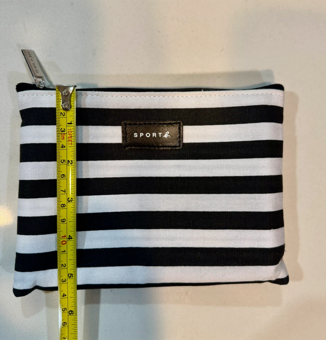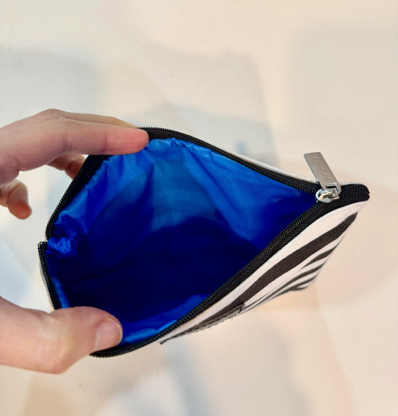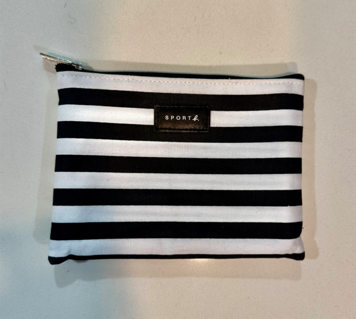 Here's a cute SPORT agnès b. pouch with a black and white striped design! The interior is a bright blue colour. It's perfect for storing your makeup, toiletries, or other small items. The pouch is in great condition and ready for a new owner.