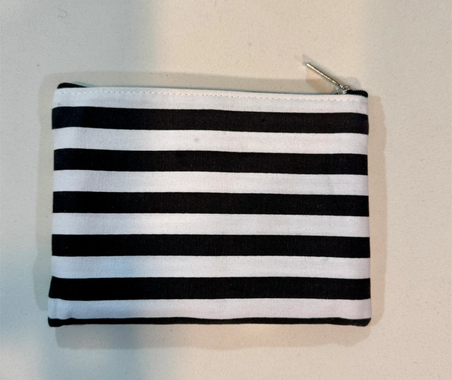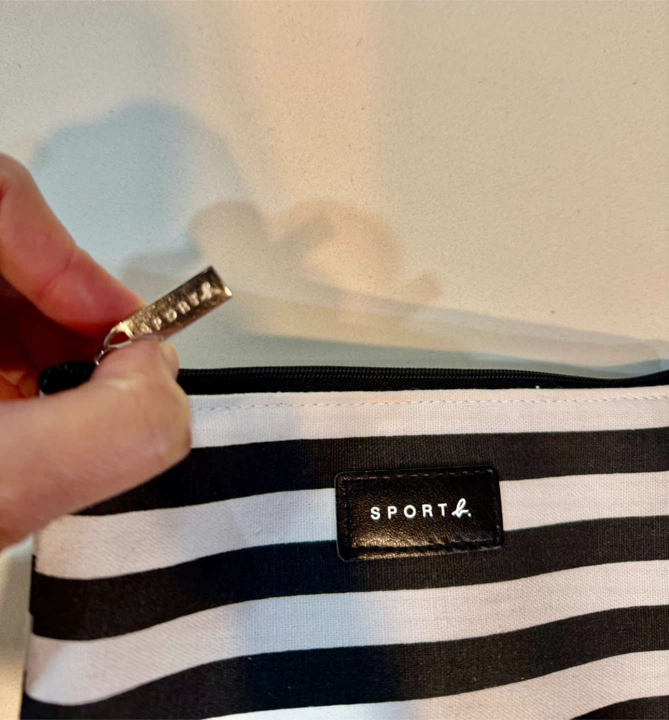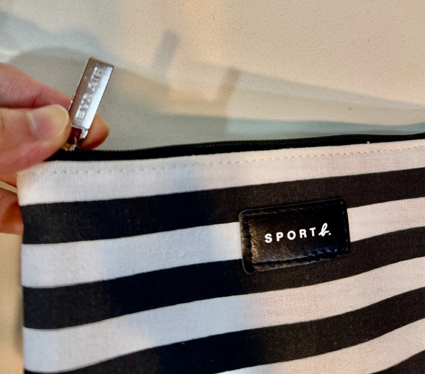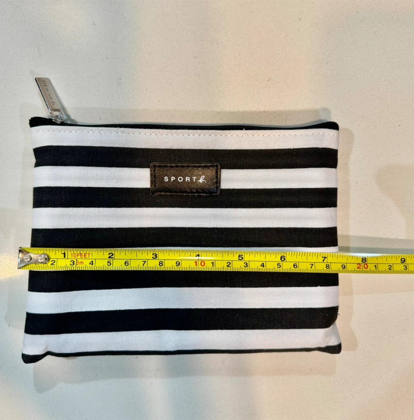 Here's a cute SPORT agnès b. pouch with a black and white striped design! The interior is a bright blue colour. It's perfect for storing your makeup, toiletries, or other small items. The pouch is in great condition and ready for a new owner.