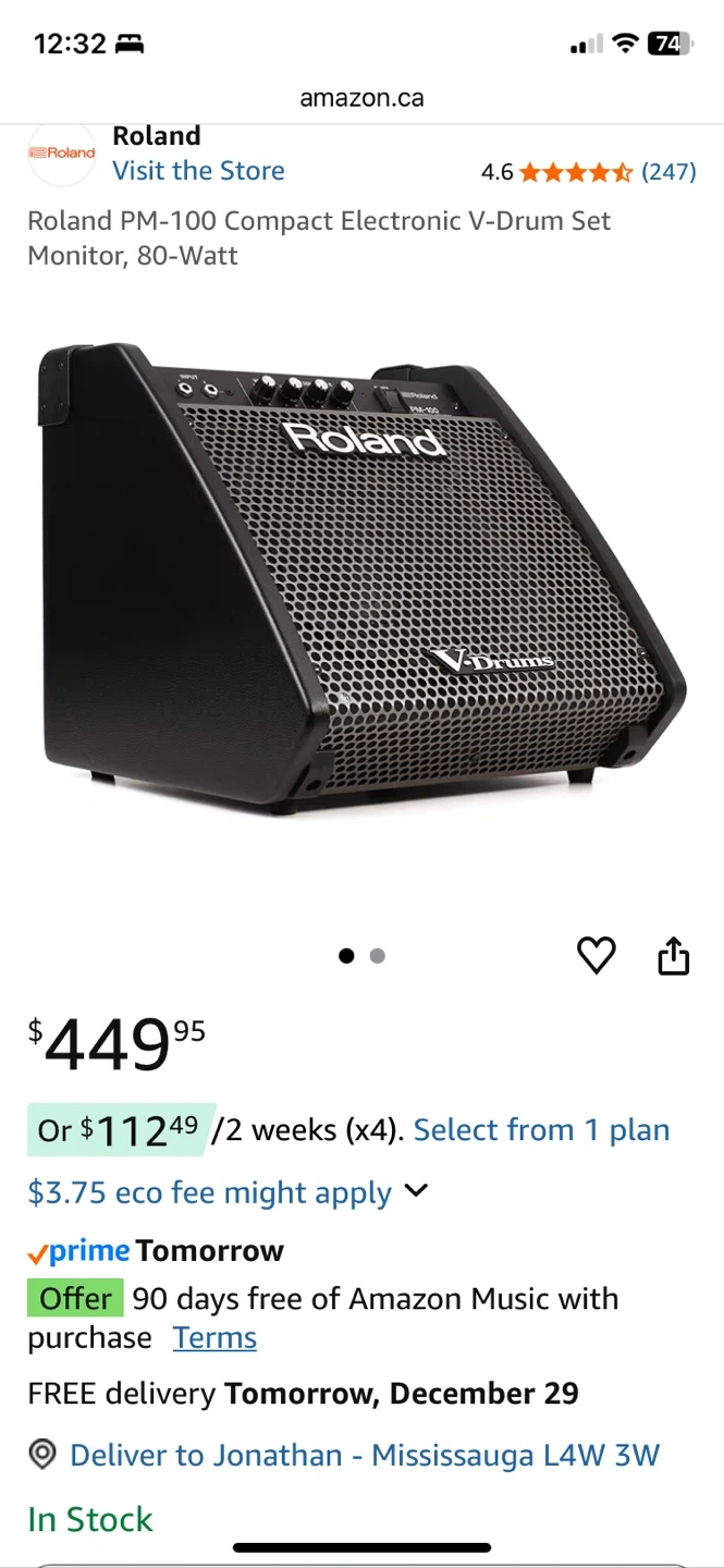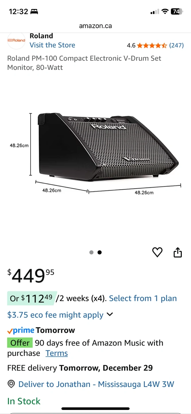 Selling a Roland PM-100 Personal Monitor, perfect for electronic drum sets! It's a compact and powerful 80-watt monitor designed for V-Drums. The dimensions are approximately 48.26cm x 48.26cm x 48.26cm. Originally bought for $449.95. i only used it 2 times. And ti is working 100% I have the possibility to show how it works before paying. Perfect to plug your electronic drum set or your piano.