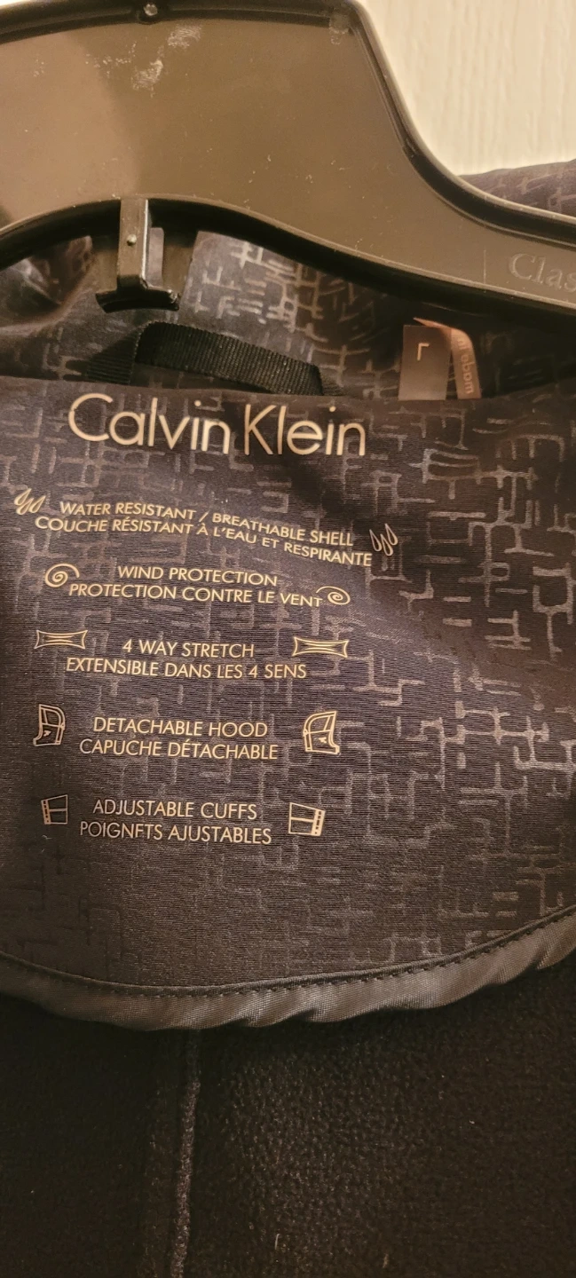 Black, large jacket, Calvin klein, used, nice pattern, detachable hood water resistant, breathable shell, wind protection, , adjustable cuffs, no belt. Great condition