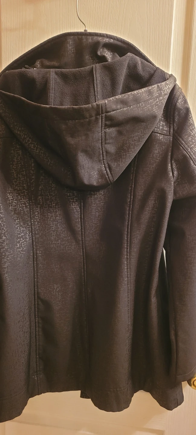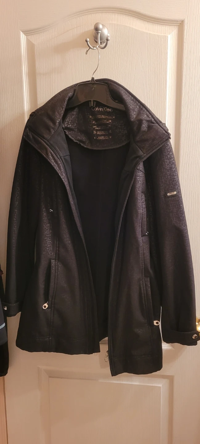 Black, large jacket, Calvin klein, used, nice pattern, detachable hood water resistant, breathable shell, wind protection, , adjustable cuffs, no belt. Great condition
