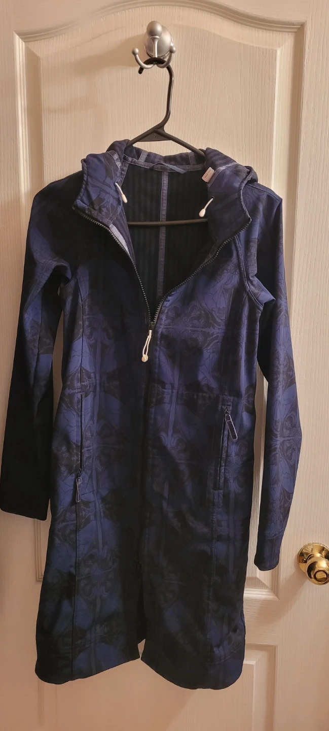 Used, lulu lemon XS, blue with pattern,attached hood, water resistant, snug fit, might be suitable for youth as well