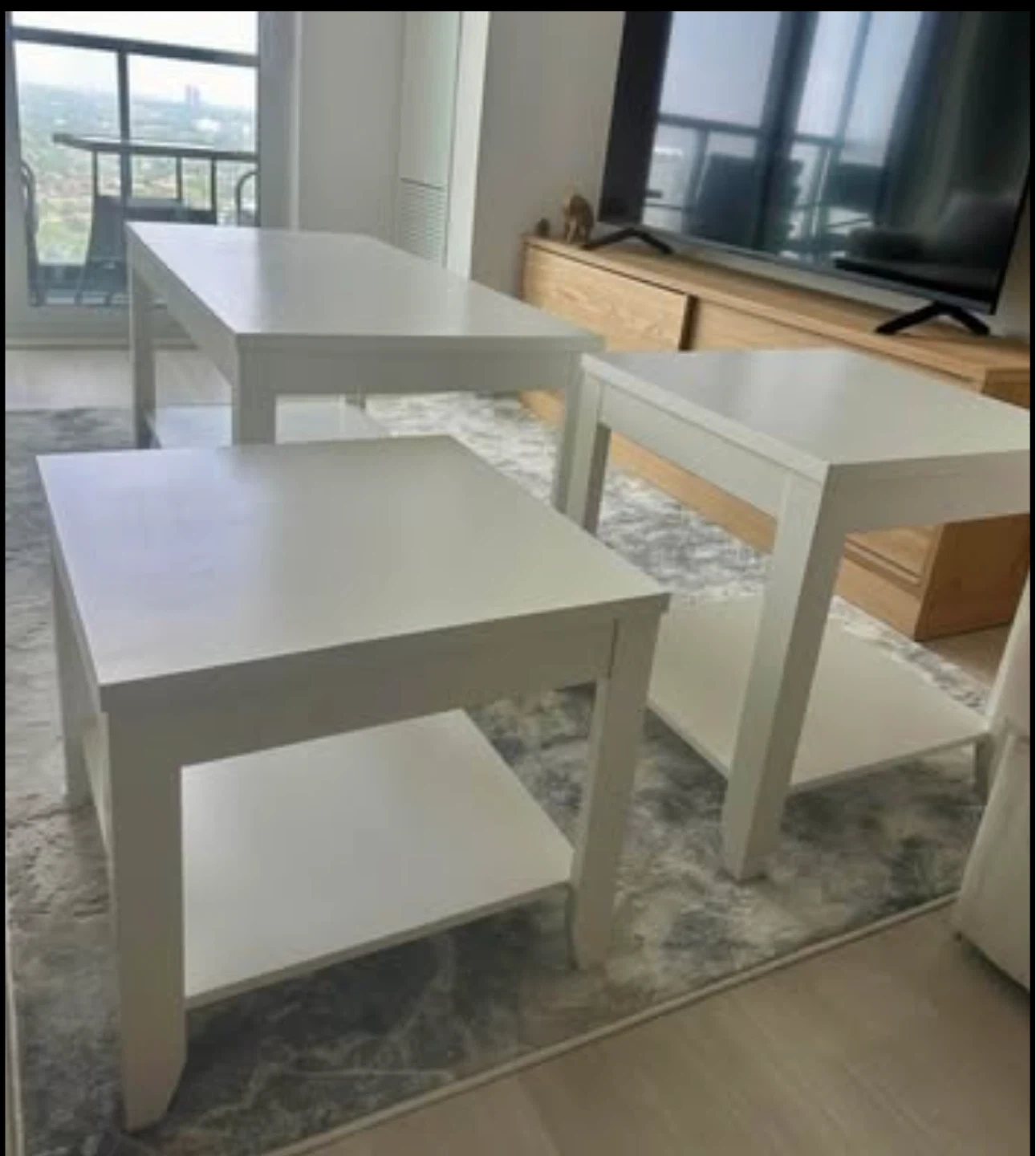 Selling a set of white side tables! They each have a shelf for extra storage or display. Perfect for a living room or bedroom