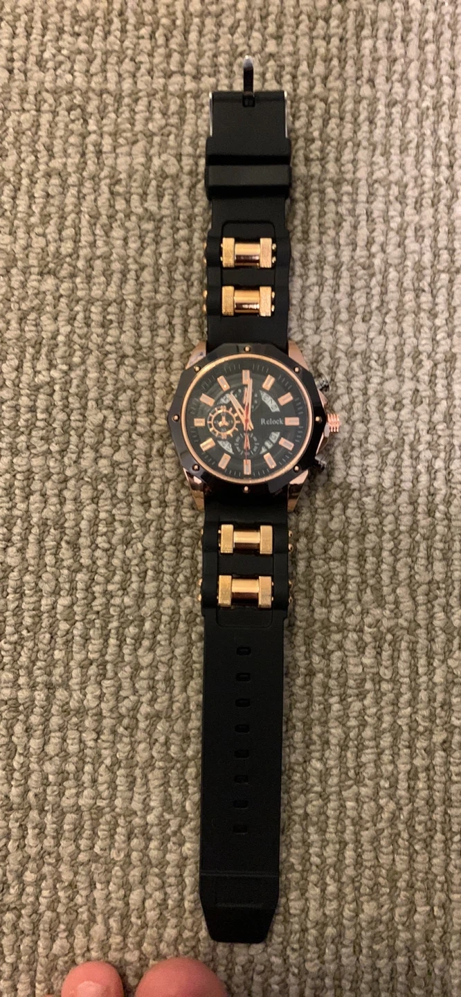 Selling a Relock men's watch with a black band and striking gold accents. It's a stylish timepiece that's sure to catch the eye!