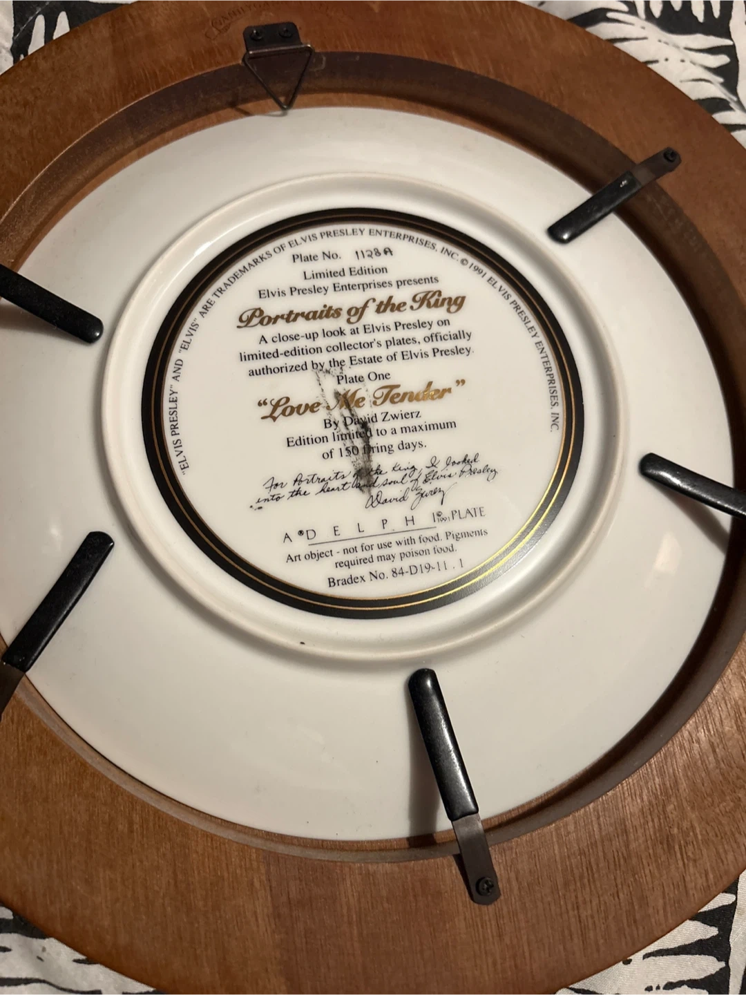 Selling a limited edition collector's plate featuring Elvis Presley, titled "Love Me Tender" by David Zwierez. It's from the "Portraits of the King" series, Plate One. Edition limited to a maximum of 150 firing days