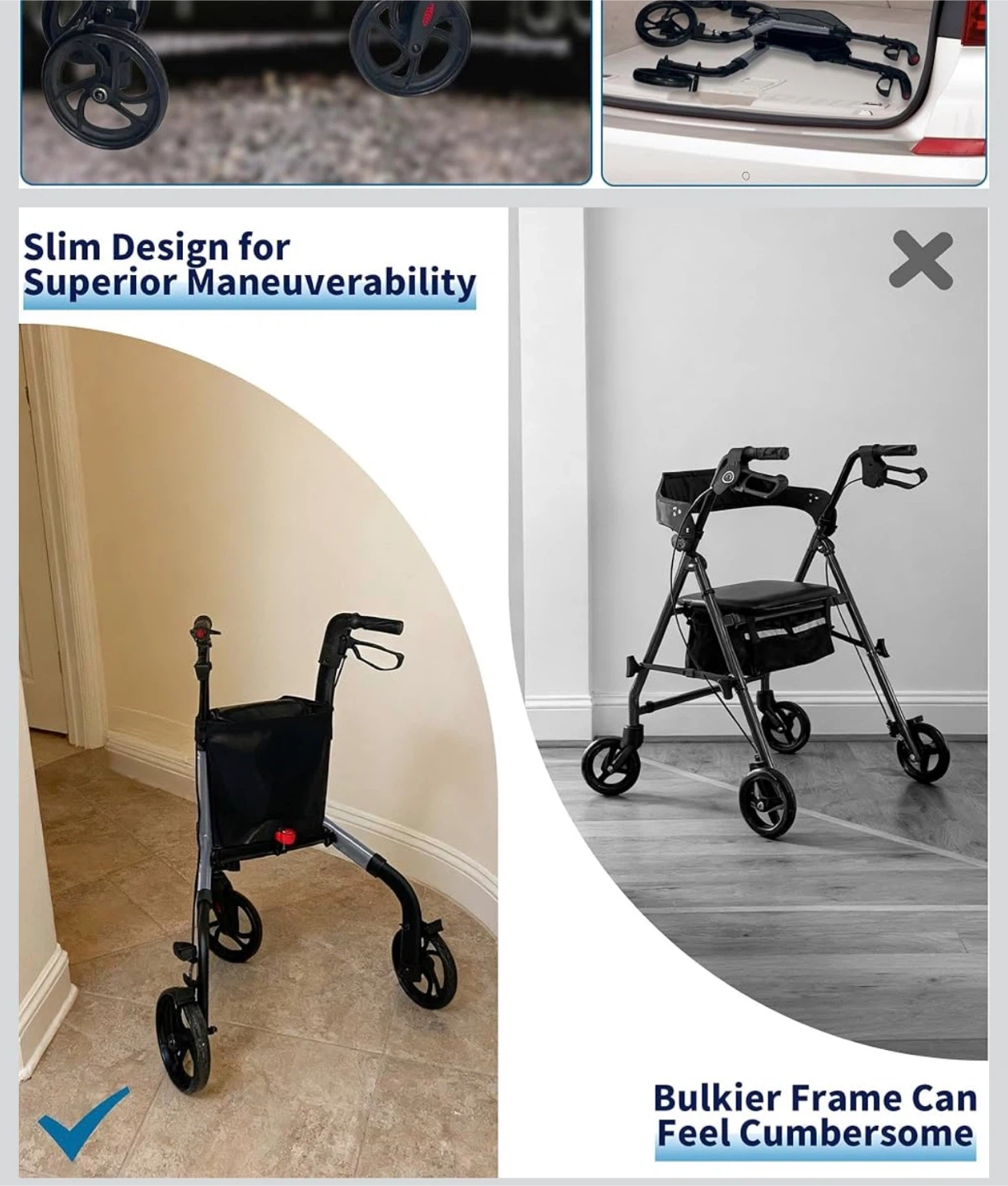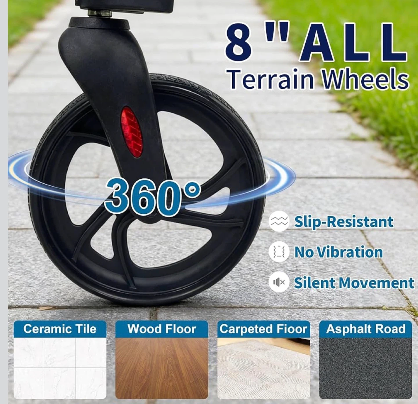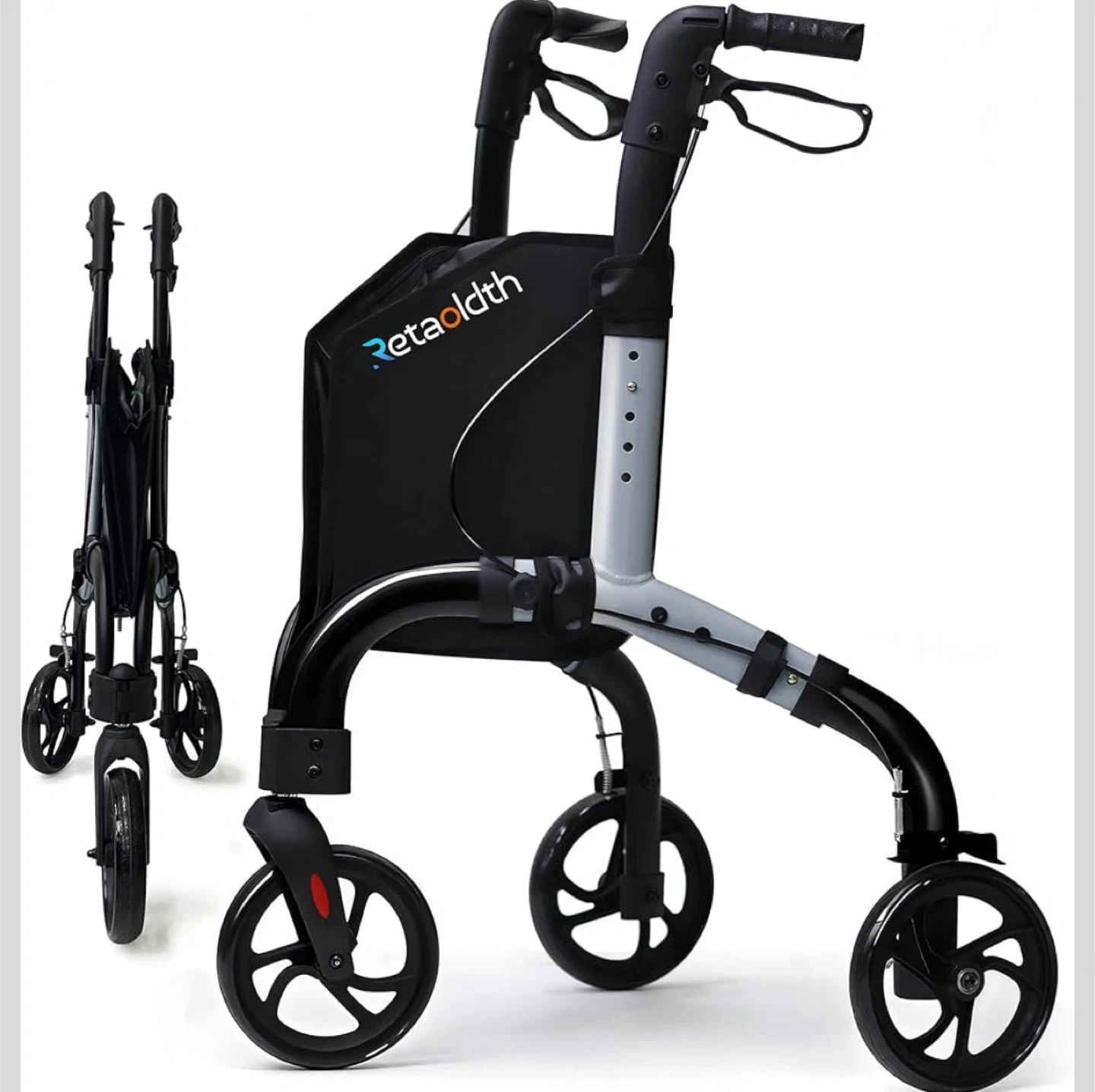 This walker is designed for enhanced stability and greater load capacity, supporting up to 350 lbs! It features an adjustable height handle with 5 levels, easily adjusted by pressing a spring button. The reflective tire and handle design improve visibility for safer movement at night. Plus, it's foldable and lightweight for easy storage and transport