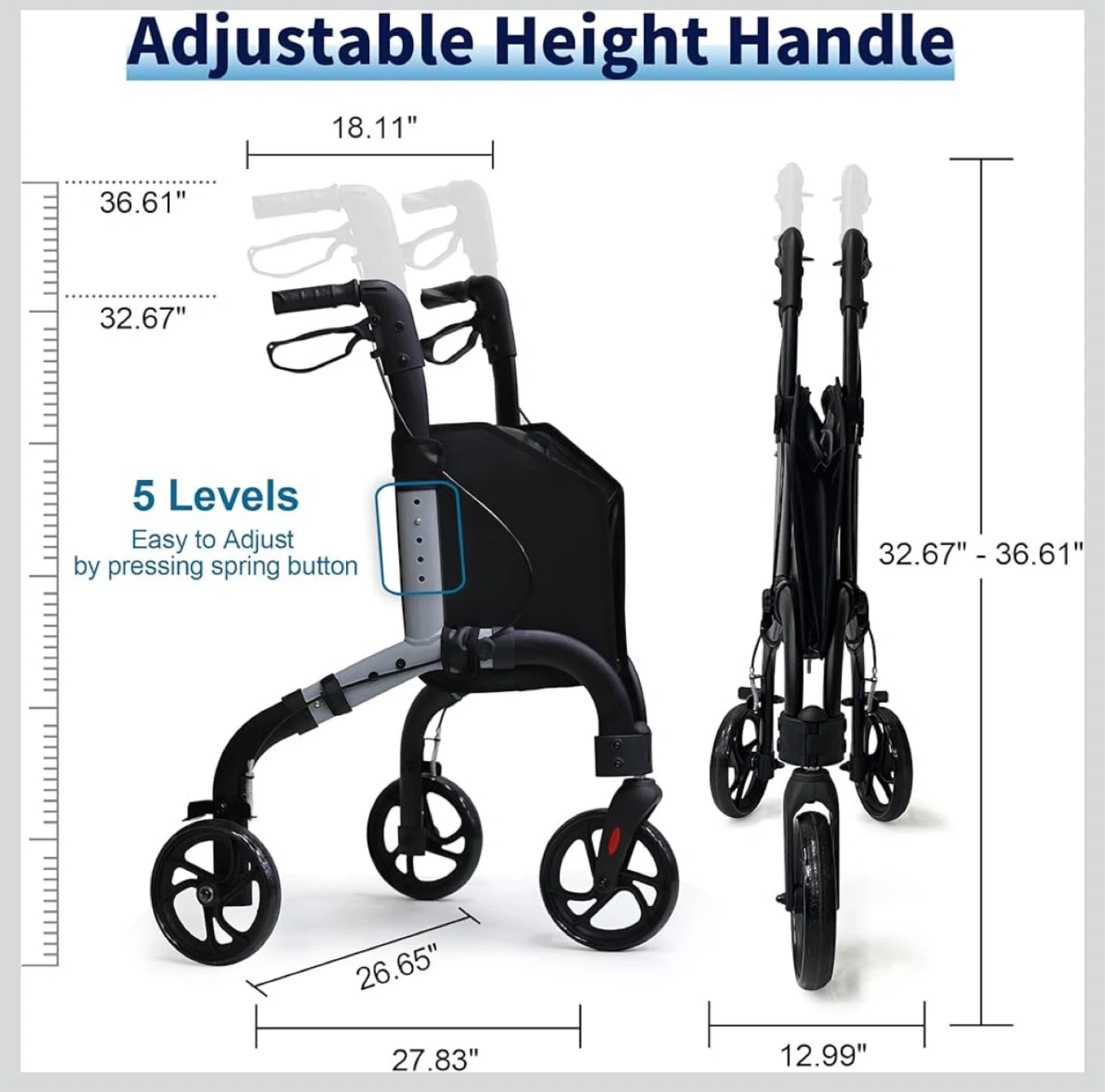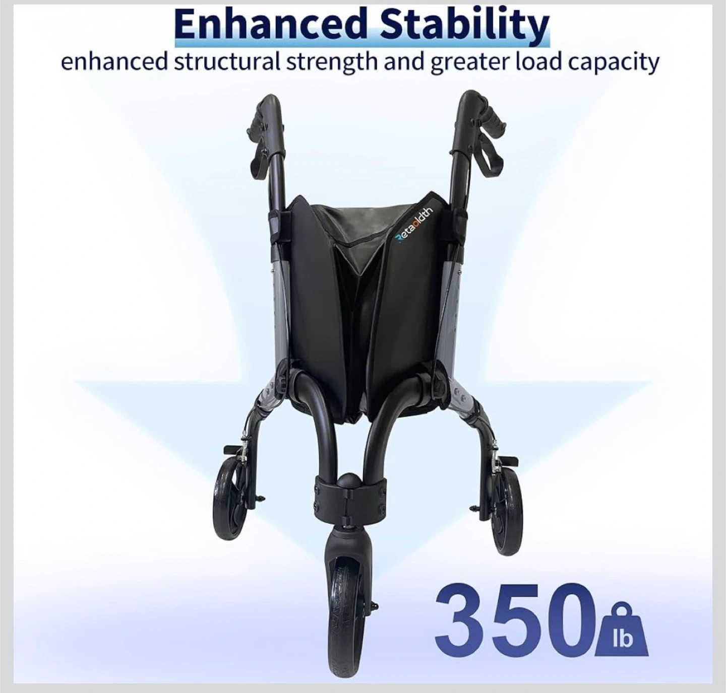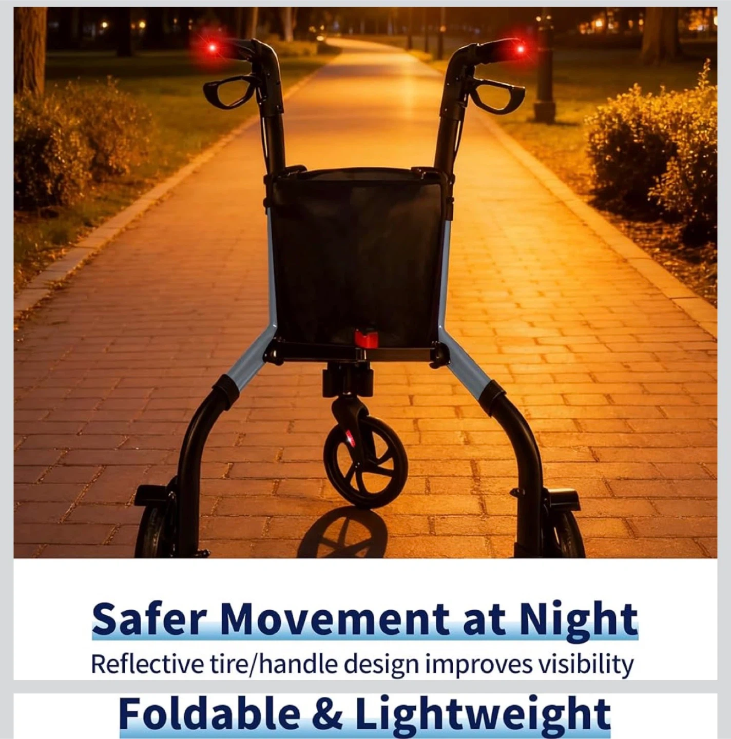 This walker is designed for enhanced stability and greater load capacity, supporting up to 350 lbs! It features an adjustable height handle with 5 levels, easily adjusted by pressing a spring button. The reflective tire and handle design improve visibility for safer movement at night. Plus, it's foldable and lightweight for easy storage and transport