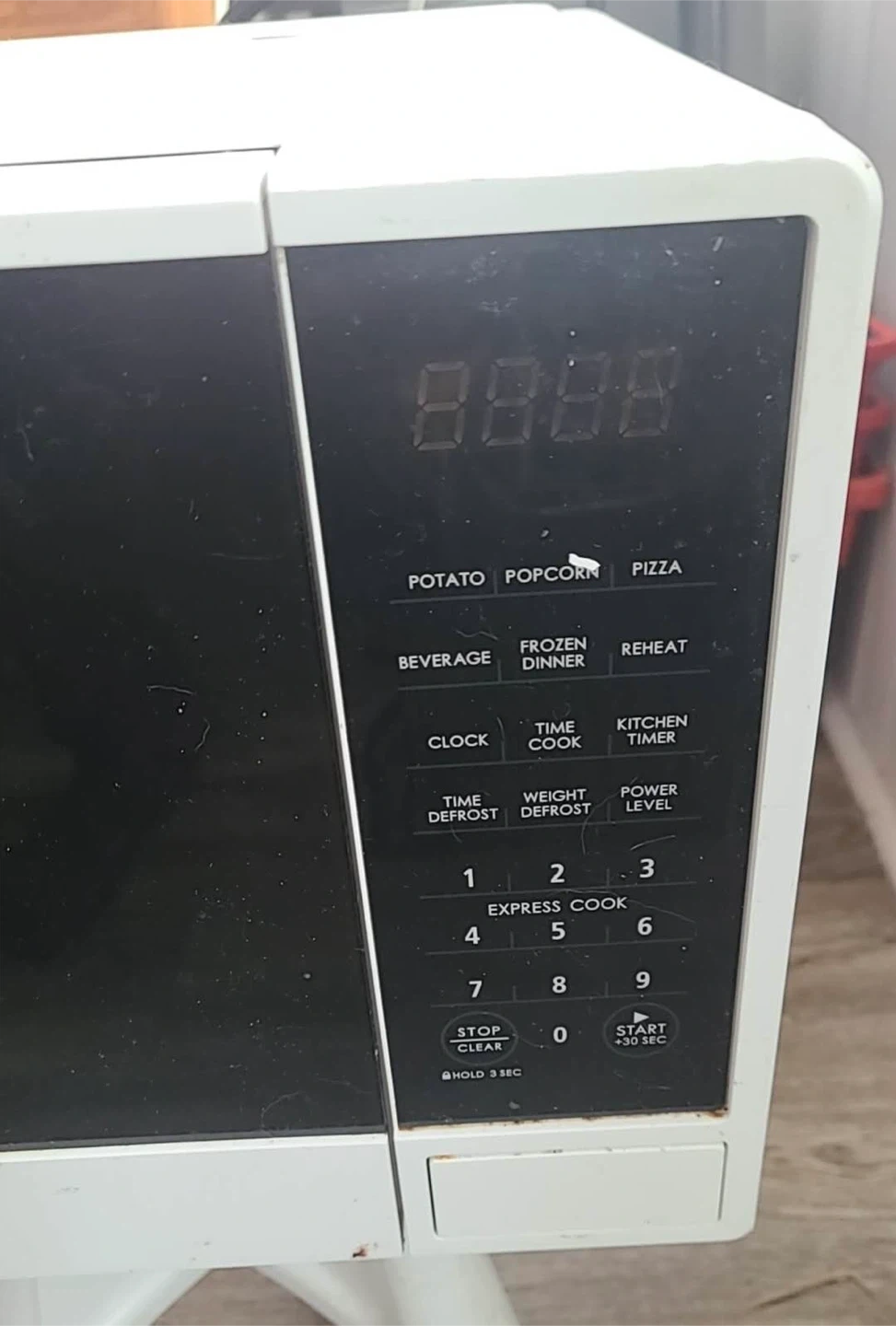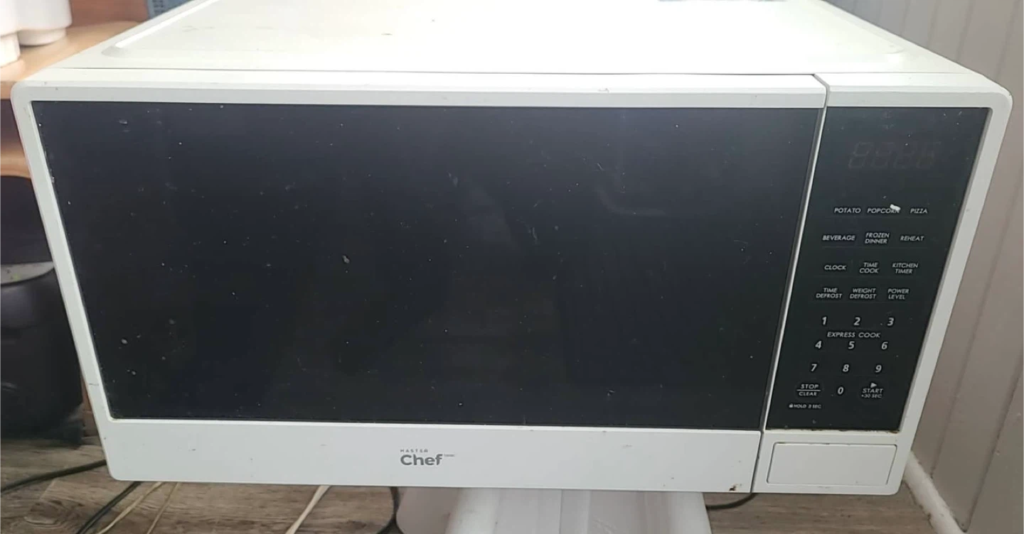 Selling a Master Chef microwave oven. It has settings for potato, popcorn, pizza, beverage, frozen dinner, and reheat. There are also settings for time cook, kitchen timer, time defrost, and weight defrost. It also has express cook settings