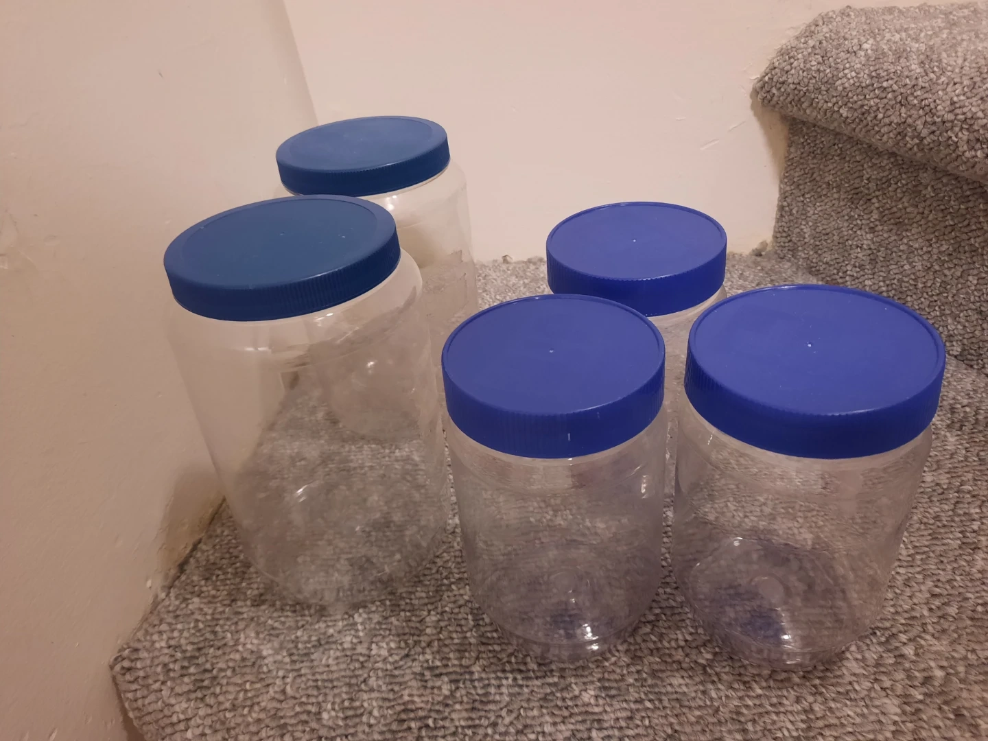 Selling a set of five plastic storage containers with blue lids. They are in great condition and ready to help you organize your pantry or garage! Perfect for storing food, craft supplies, or anything else you need to keep tidy