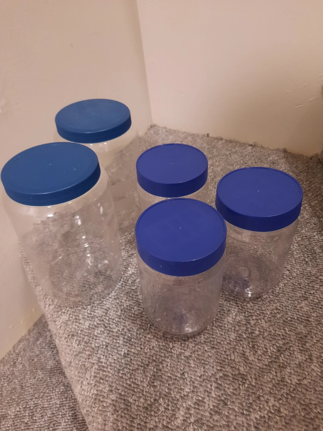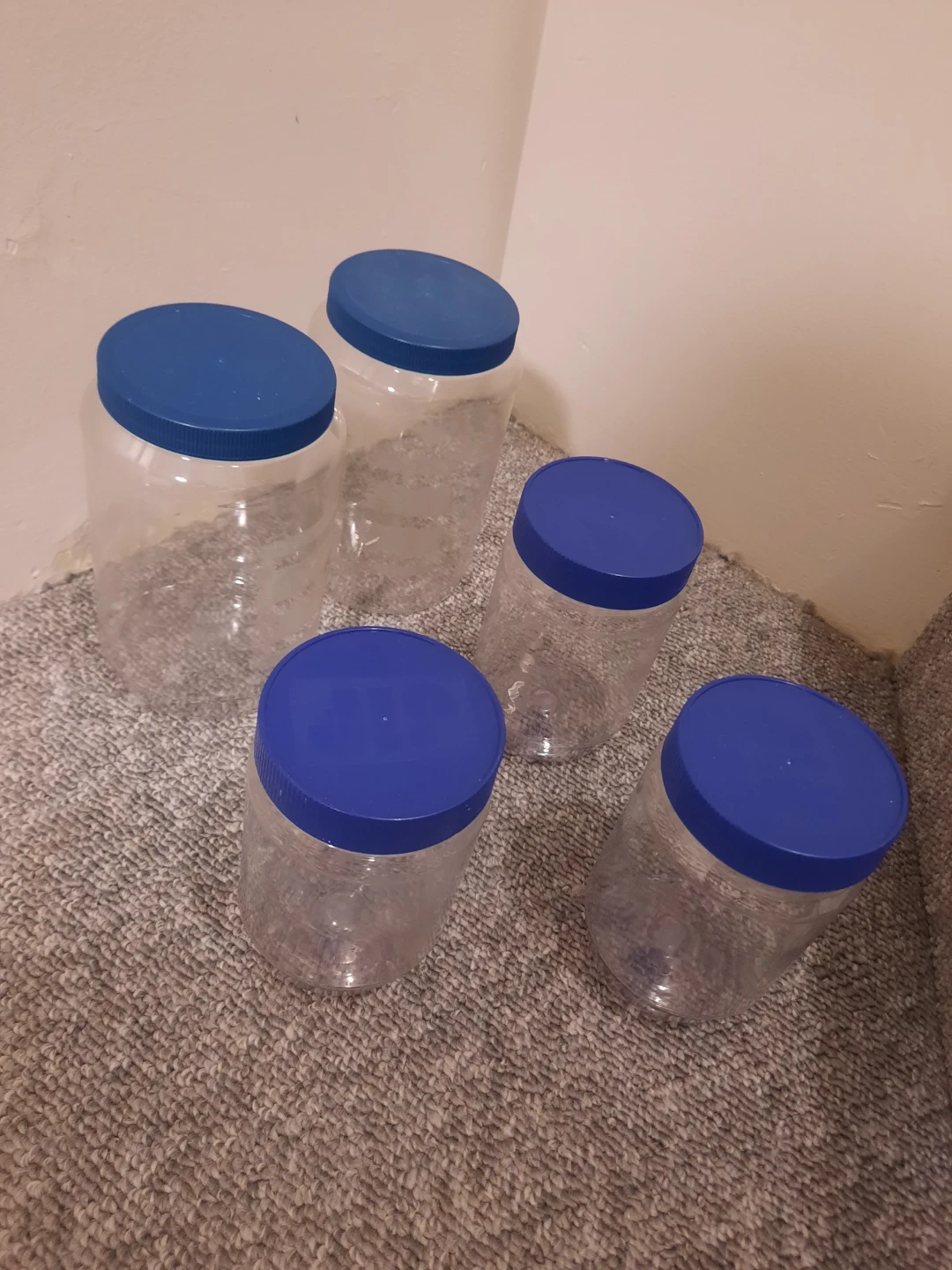 Selling a set of five plastic storage containers with blue lids. They are in great condition and ready to help you organize your pantry or garage! Perfect for storing food, craft supplies, or anything else you need to keep tidy