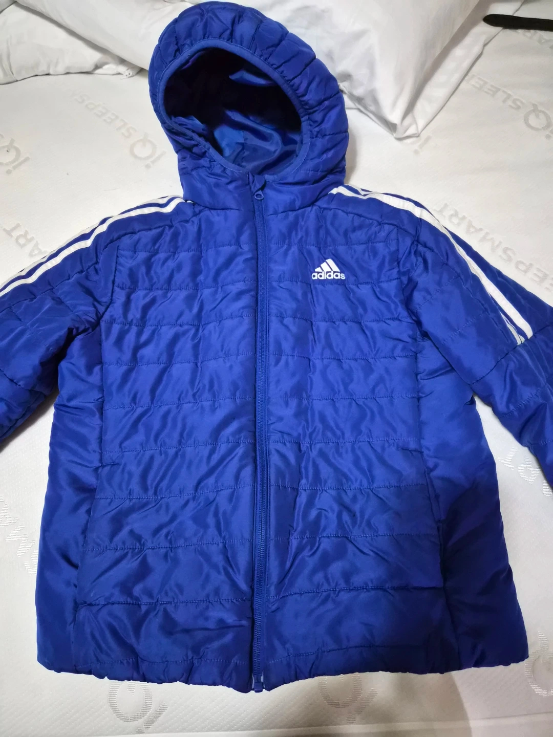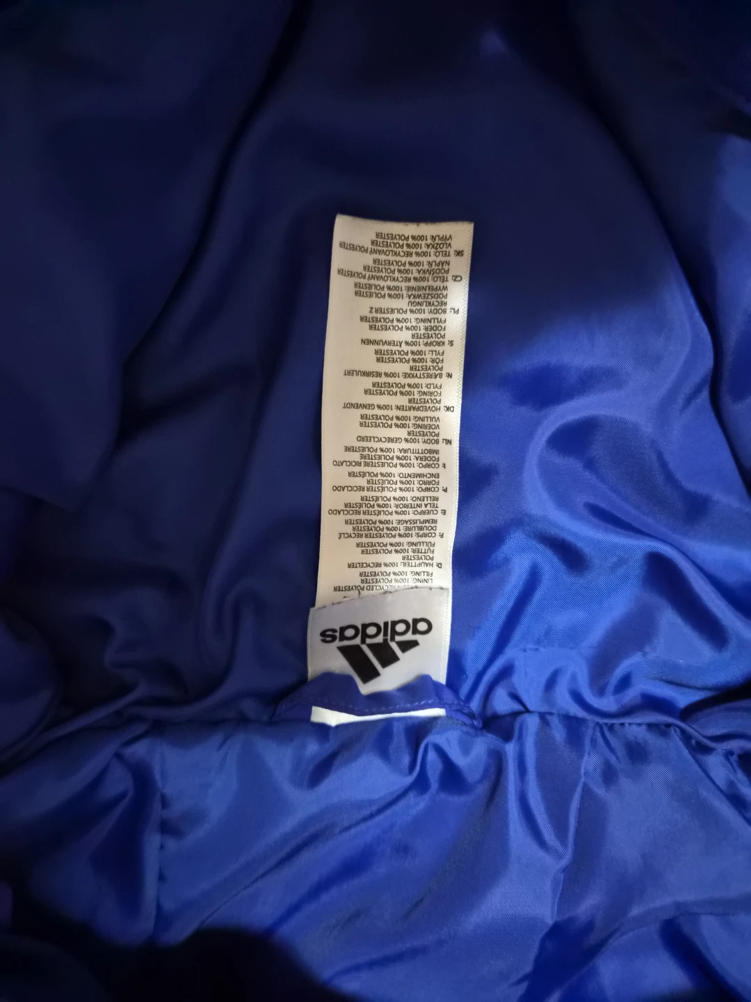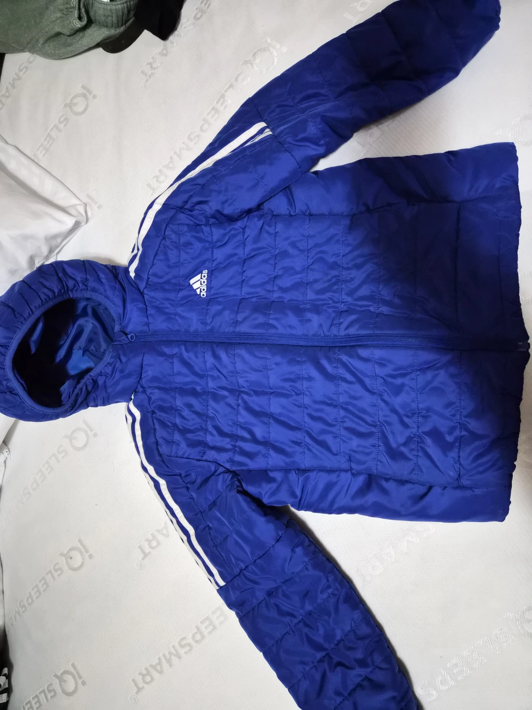 This Adidas puffer jacket is in great condition and ready for a new owner! It's a vibrant blue with the classic three stripes. Size M. For kids or youth