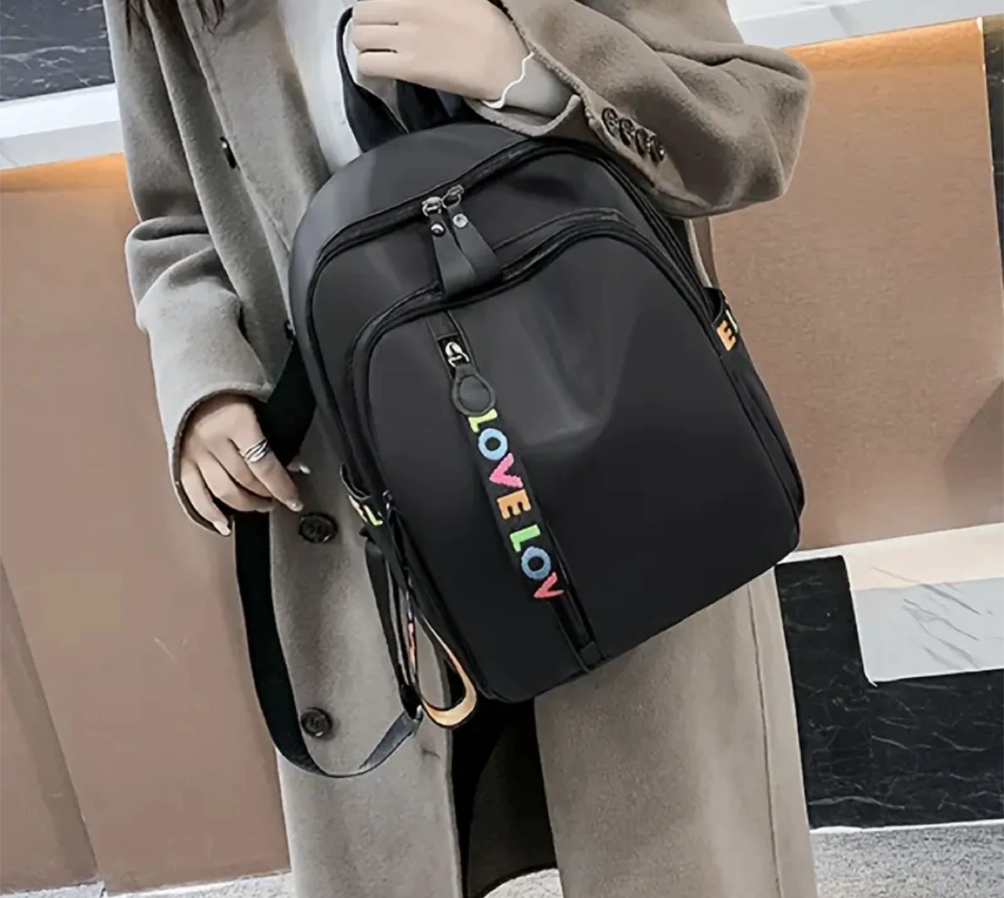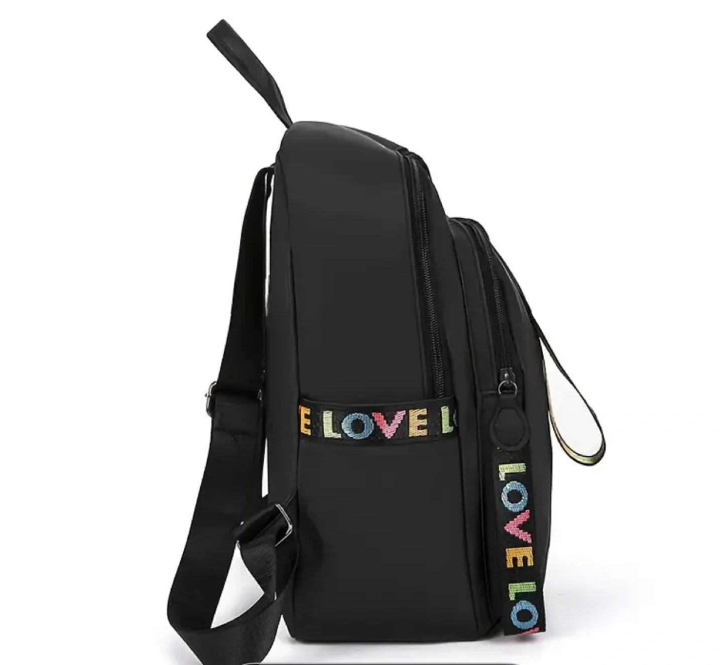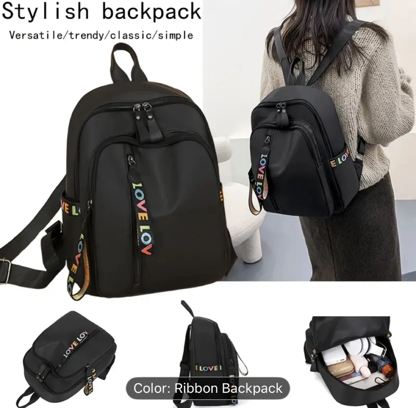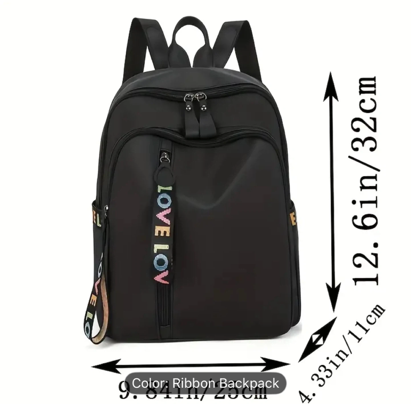 Stylish black backpack with a fun ribbon detail that says 'Love Lov'! This backpack is versatile, trendy, classic, and simple, making it perfect for everyday use. The dimensions are approximately 12.6 inches in height and 9.84 inches in width.