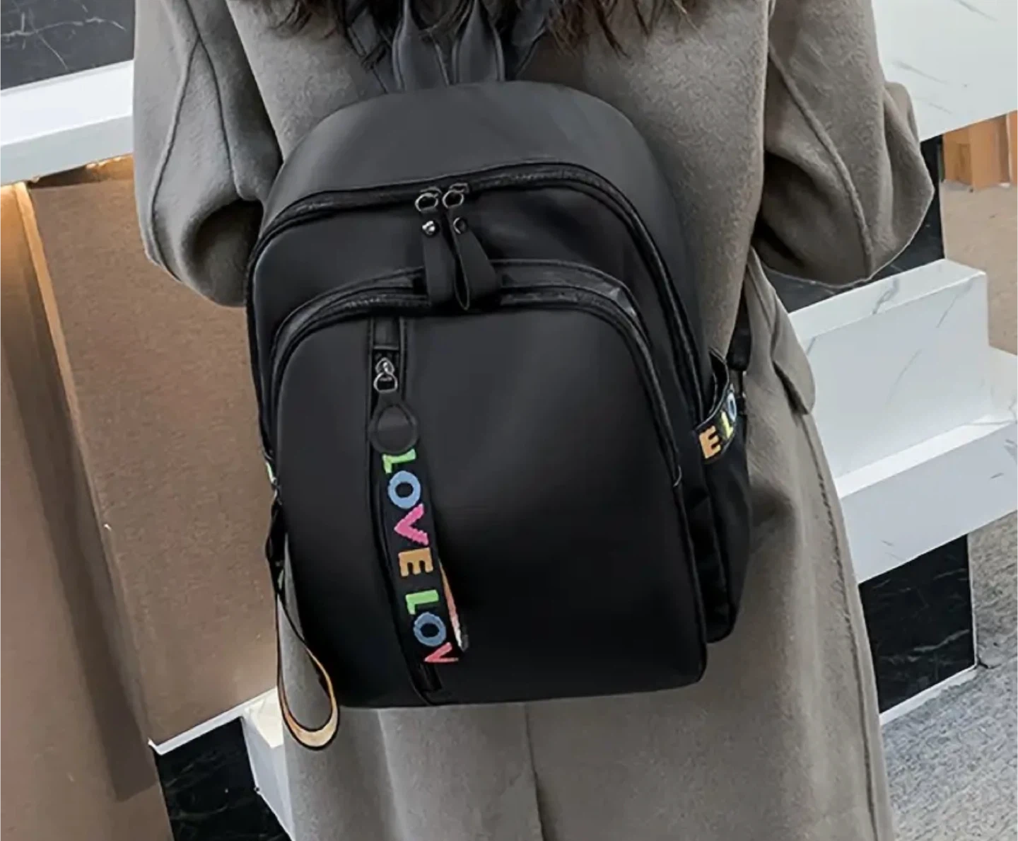 Stylish black backpack with a fun ribbon detail that says 'Love Lov'! This backpack is versatile, trendy, classic, and simple, making it perfect for everyday use. The dimensions are approximately 12.6 inches in height and 9.84 inches in width.