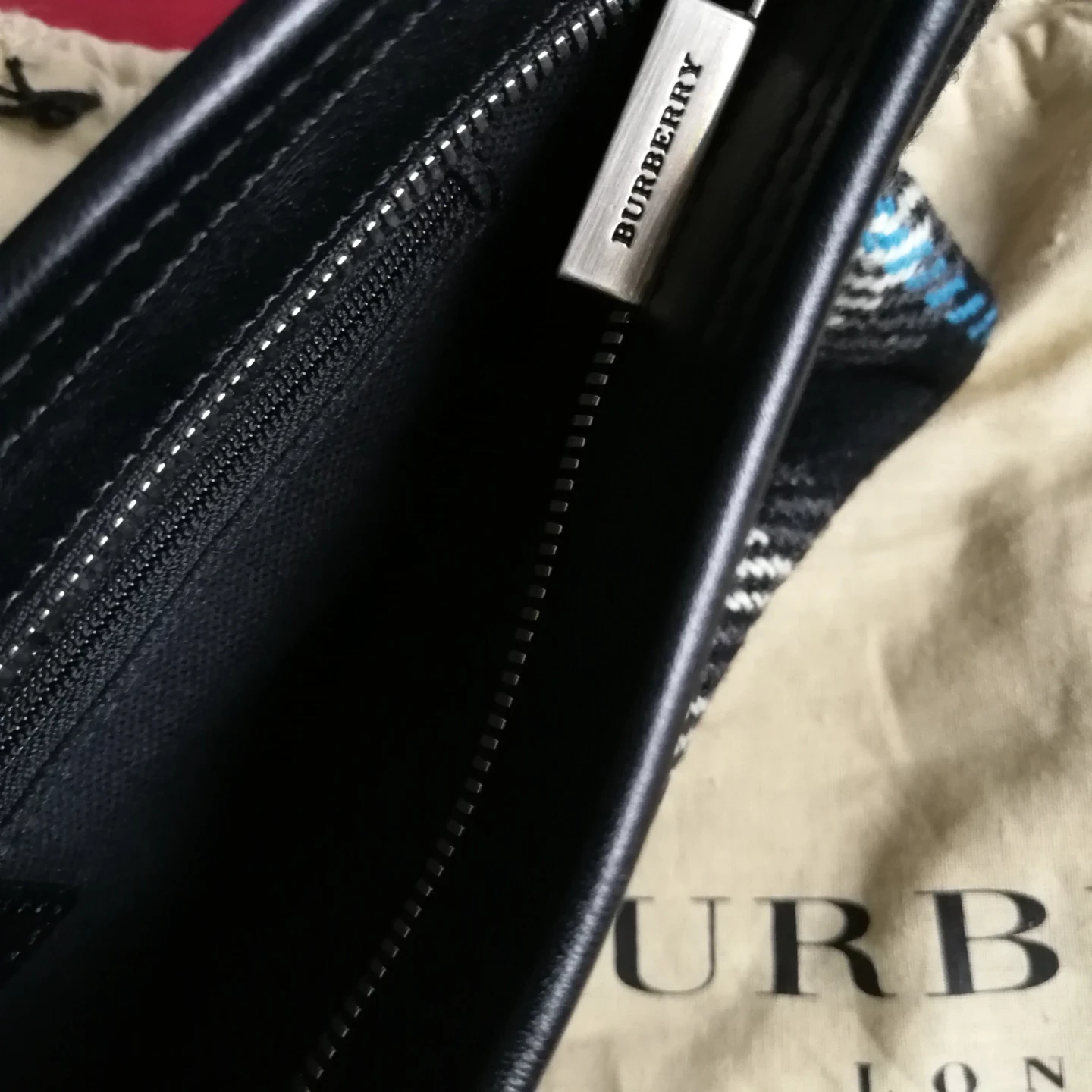 Selling a clutch with a stylish plaid design. It features black leather accents and a silver zipper. Comes with a dust bag to keep it protected! Branded as Burberry, but not sure authentic, hence the very low price.