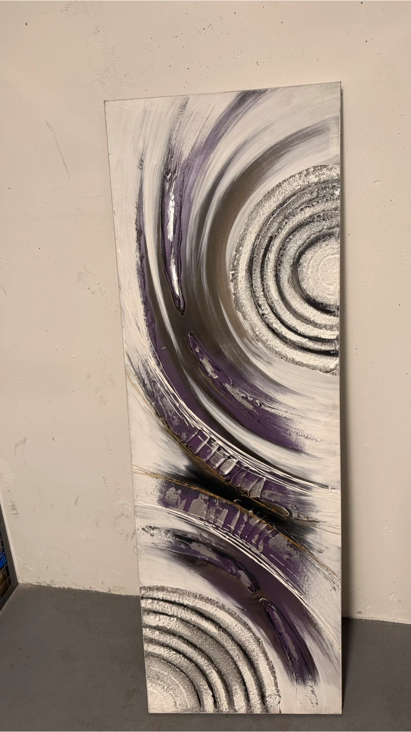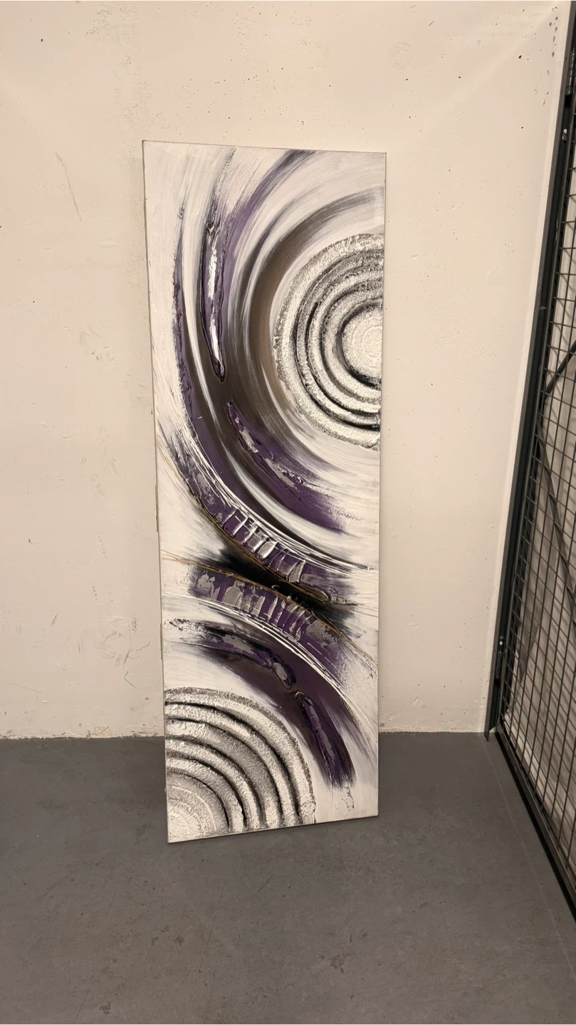 This is an abstract art canvas painting with a unique design. The colours are a mix of white, purple, silver and black. It's in great condition and would look great in any room!